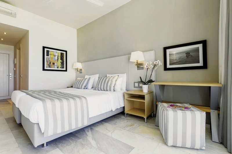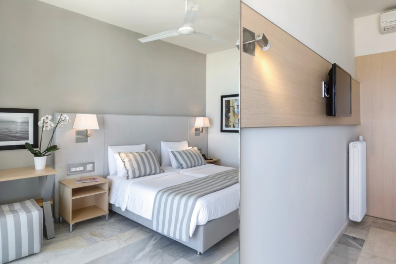 Das Hotel bietet drei Arten von Zimmern: Doppelzimmer Landseite, Studio und Apartments mit 2 Schlafzimmern. Alle Zimmerkategorien sind komfortabel und mit Annehmlichkeiten wie Bad oder Dusche/WC, Föhn, Minikühlschrank, Sat.-TV, Telefon, Balkon oder Terrasse, WLAN und Klimaanlage ausgestattet. Je nach Zimmerkategorie verfügen sie zusätzlich über eine Kitchenette oder getrennte Schlafzimmer.