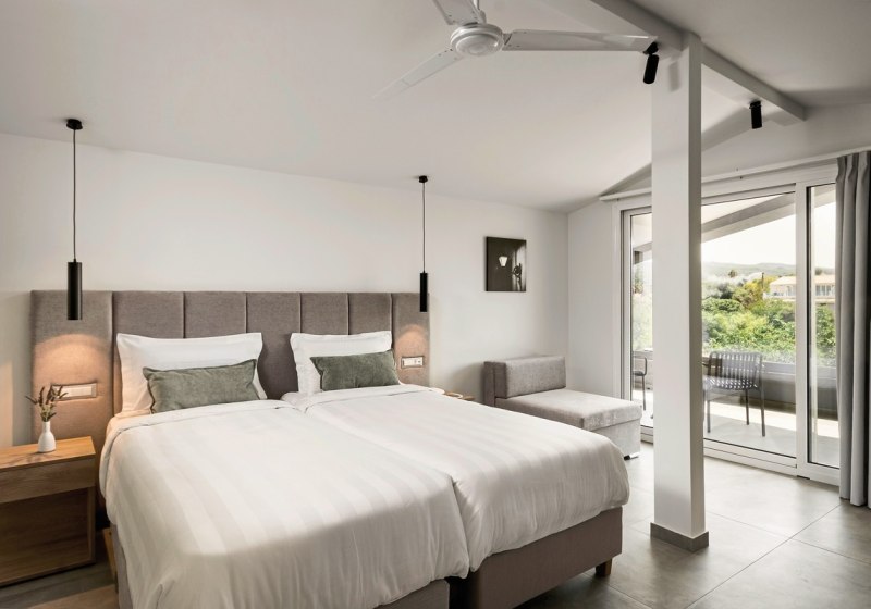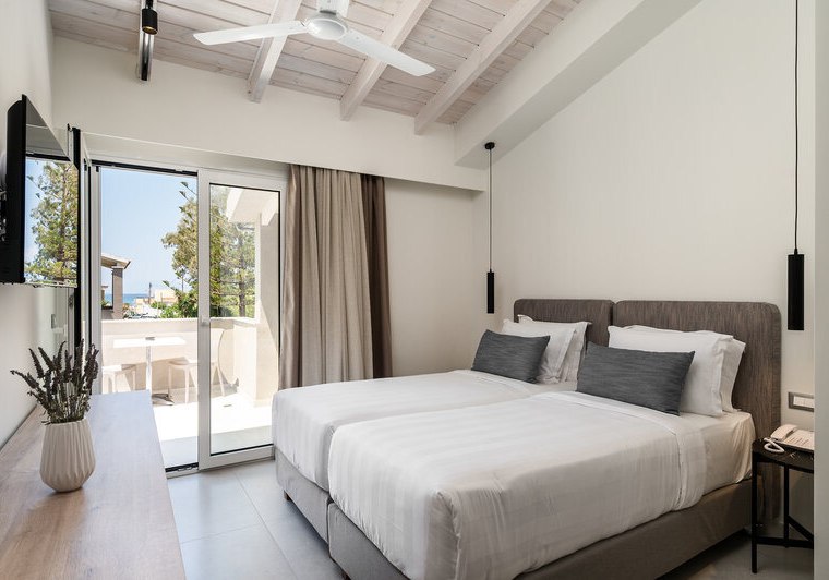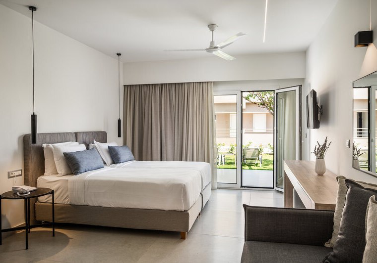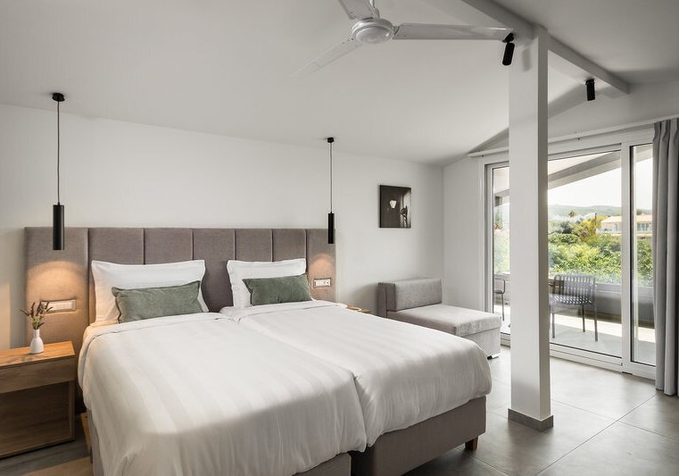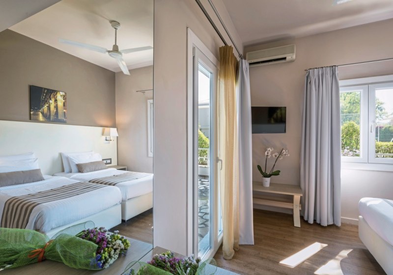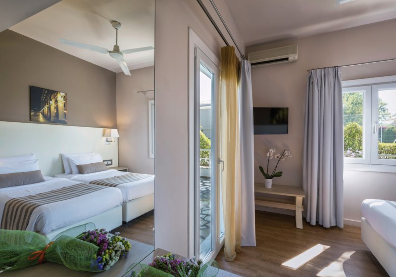 Im Acharavi Beach Hotel wohnt Ihr unmittelbar am langen, flach abfallenden Sand- und Kiesstrand von Acharavi. Der Blick wechselt zwischen Meer, Garten und den ruhigen Wegen der Anlage. Ihr startet den Tag mit kurzen Wegen: vom Zimmer über die Gartenanlage zur Sonnenterrasse, weiter zum Pool oder direkt an den Strand. Das Haus richtet sich an Strandliebhaber und Familien, die kurze Distanzen und klare Strukturen schätzen.