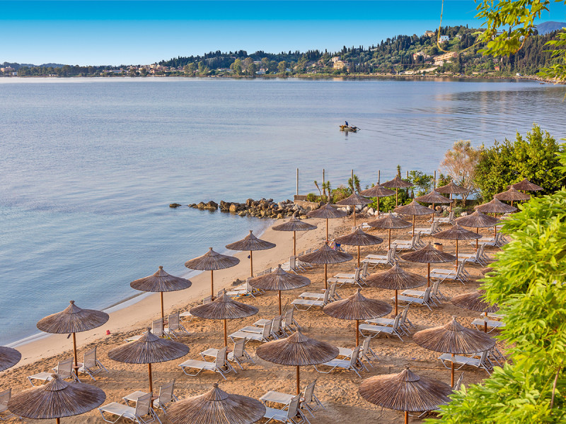 Ihr urlaubt in Kontokali auf Korfu, auf einer kleinen Halbinsel mit direkter Strandlage. Zwei Sandstrände gehören zur Anlage und sind per Lift erreichbar – praktisch, wenn Ihr zwischen Meer und Resort pendeln wollt. Zur Buchtlage gesellt sich ein weiter Blick und eine ruhige, maritime Stimmung.