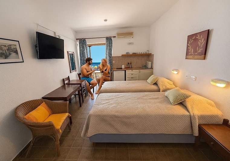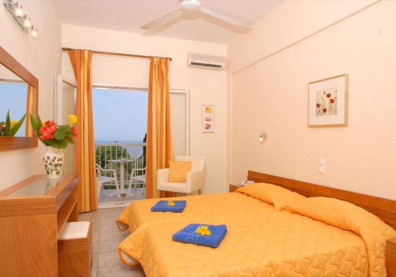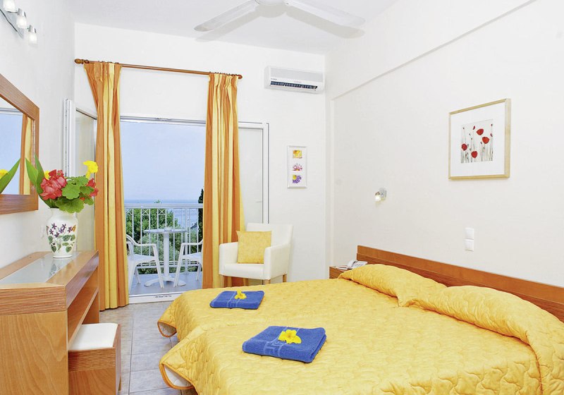 Die Zimmer sind funktional ausgestattet: Dusche, Föhn, Sat-TV, Telefon und Minikühlschrank, dazu Mietsafe und Heizung. Klimaanlage steht gegen Gebühr bereit. Doppel- und Familienzimmer verfügen über einen Balkon, wahlweise mit Meerblick, während Einzelzimmer ohne Balkon in Richtung Innenhof liegen.