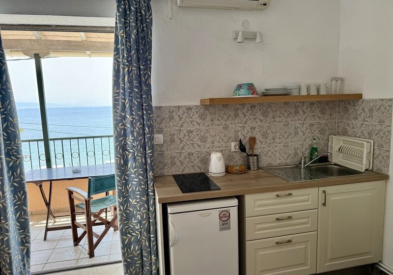Nur 80 Meter trennen Euch vom Kies-Sandstrand, 100 Meter vom Zentrum von Ipsos. So kombiniert Ihr Badepausen mit kurzen Wegen zu Tavernen und Läden. Der Flughafen liegt rund 15 Kilometer entfernt, praktisch für die Anreise. Die Lage wirkt kompakt, angenehm nah am Geschehen und doch in Griffweite des Meeres.