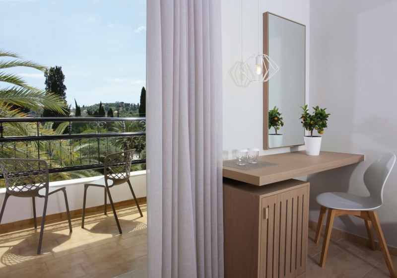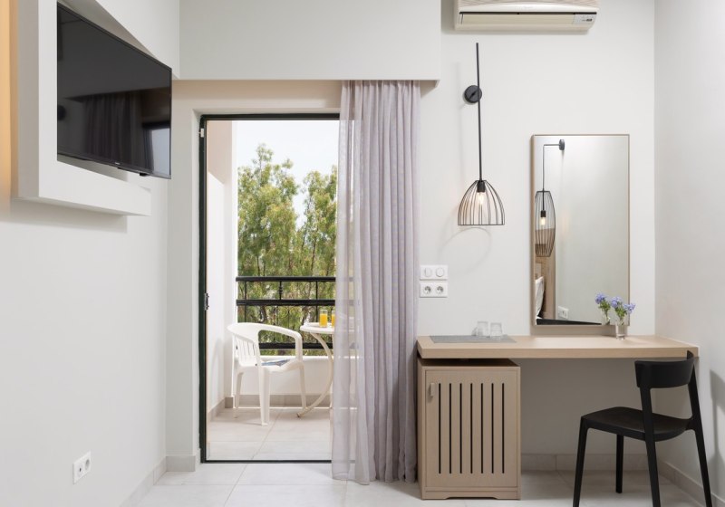 Alle Zimmer verfügen über einen möblierten Balkon mit Gartenblick – ein ruhiger Ort für den ersten Kaffee oder die letzte Brise am Abend. In den Superior-Zimmern steht Euch zusätzlich ein Wasserkocher bereit, praktisch für Tee- und Kaffeepausen. Die klare Gestaltung und die verlässliche Grundausstattung unterstützen einen geordneten Tagesrhythmus in den Ferien.