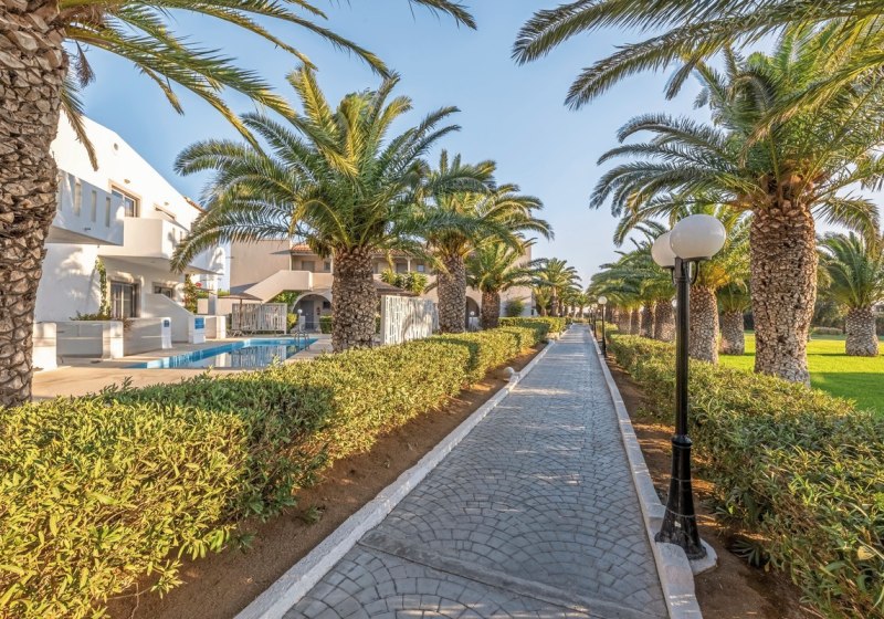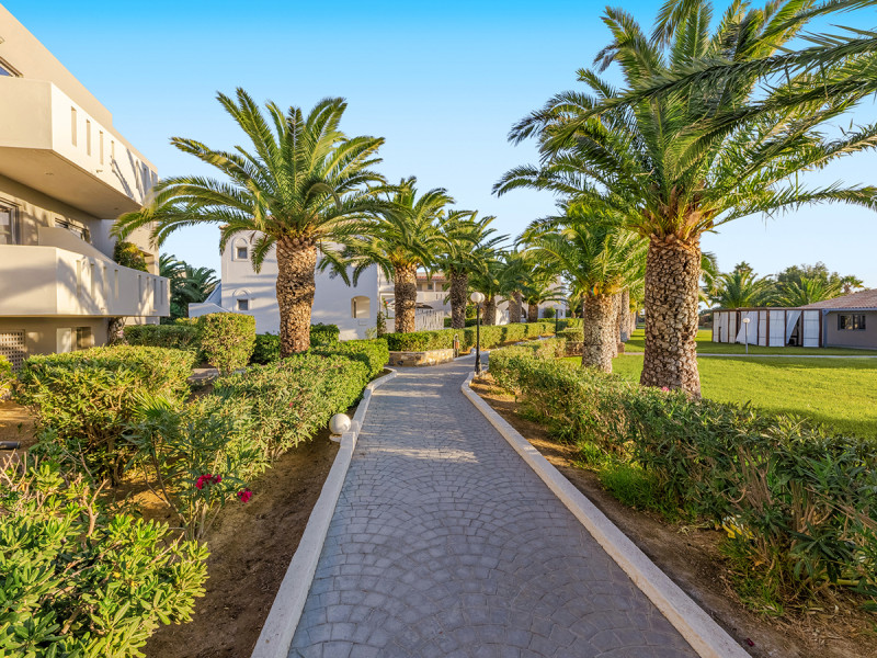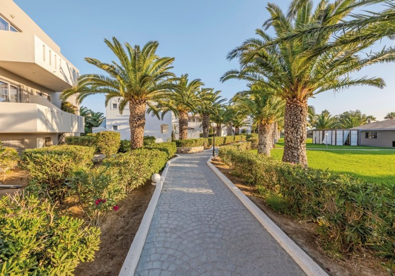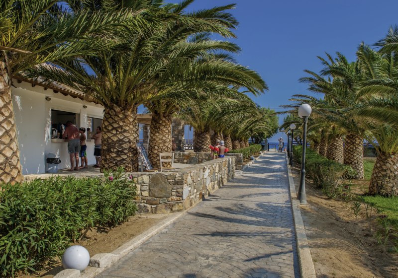 Im Akti Beach Club erwartet Euch eine weitläufige Anlage mit 26 Gebäuden, in der Ihr Euch zwischen Gartenwegen, Terrassen und mehreren Poolbereichen bewegt. Die Atmosphäre wirkt entspannt und strukturiert zugleich: tagsüber aktiv, abends angenehm lebhaft. Familien schätzen den großzügigen Kinderbereich und den Miniclub, Ruhesuchende den Adults-only-Bereich „Akti Kalimera“ ab 16 Jahren mit eigenem Restaurant, Snackbar und Poolzone. Dank direkter Strandlage, nur durch eine Straße getrennt, habt Ihr kurze Wege zum Wasser und zu den Liegen mit Schirmen.