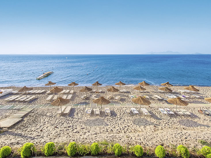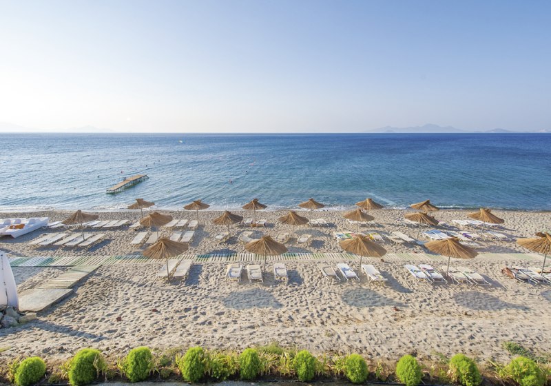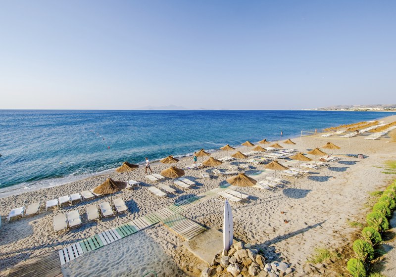Das Resort liegt ruhig außerhalb des Ortes, mit direkter Strandlage am Sand- und Kiesstrand; nur eine Straße trennt Anlage und Ufer. Bis zum Ortszentrum sind es etwa 4 Kilometer, zum Stadtzentrum rund 30 Kilometer. Ein Hotelbus verbindet Euch mit Kardamena, wodurch Ihr flexibel Ausflüge, Shopping und Hafenflair einplant. Zwischen Strandbar, Liegen und Schirmen bleibt der Tagesablauf angenehm kurz und übersichtlich organisiert.