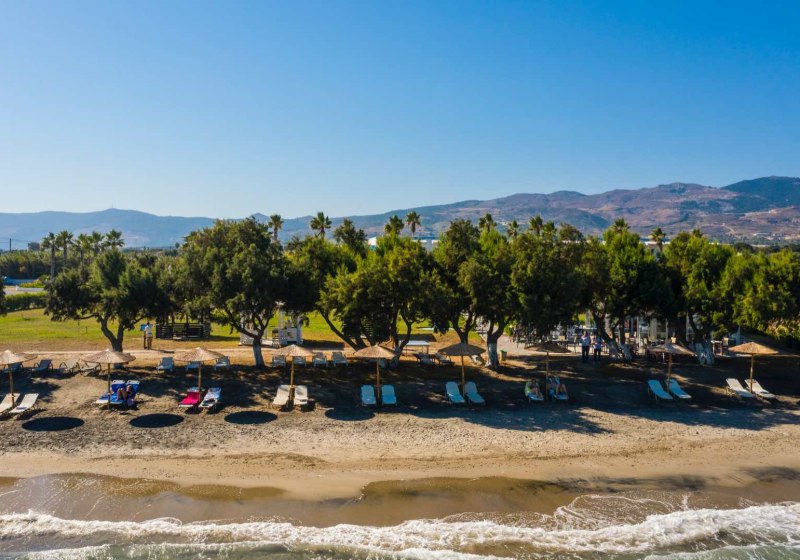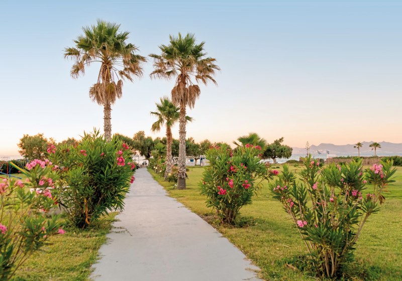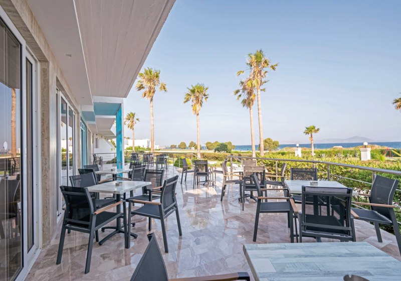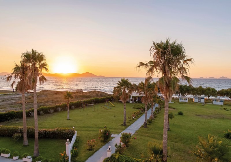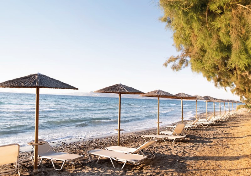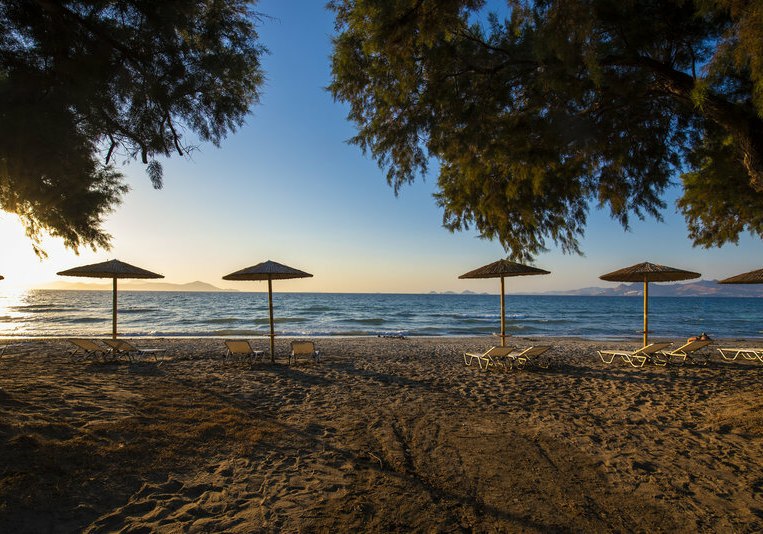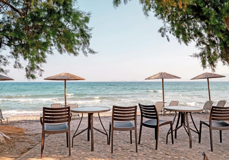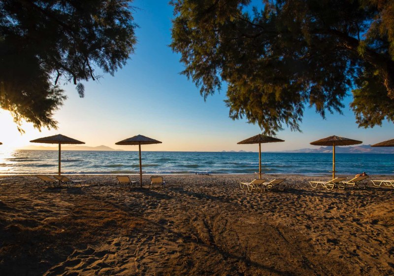 Ihr residiert auf Kos direkt am hoteleigenen Sandstrand, mit breitem Blick und kurzer Verbindung ins Inselleben. Bis Kos-Stadt und zum touristischen Zentrum sind es etwa 4 km – nah genug für spontane Ausflüge, weit genug für einen klaren Strandfokus. Bars und Restaurants findet Ihr in rund 1 km Distanz, was Abendspaziergänge unkompliziert macht, während die Rückkehr ins Ruhigere rasch gelingt.