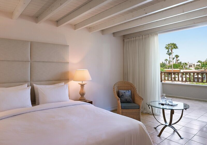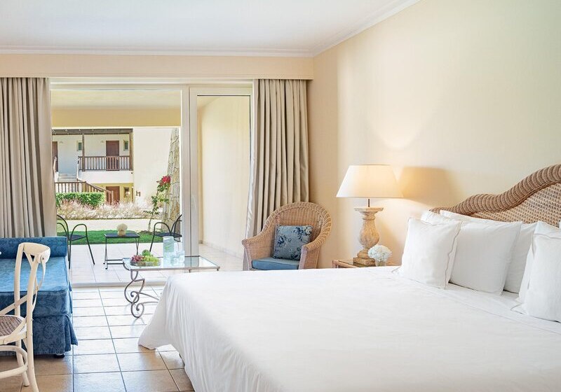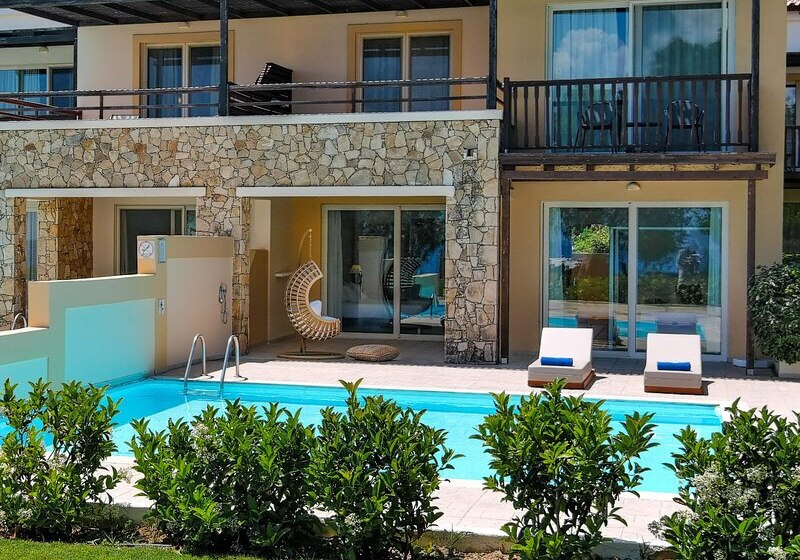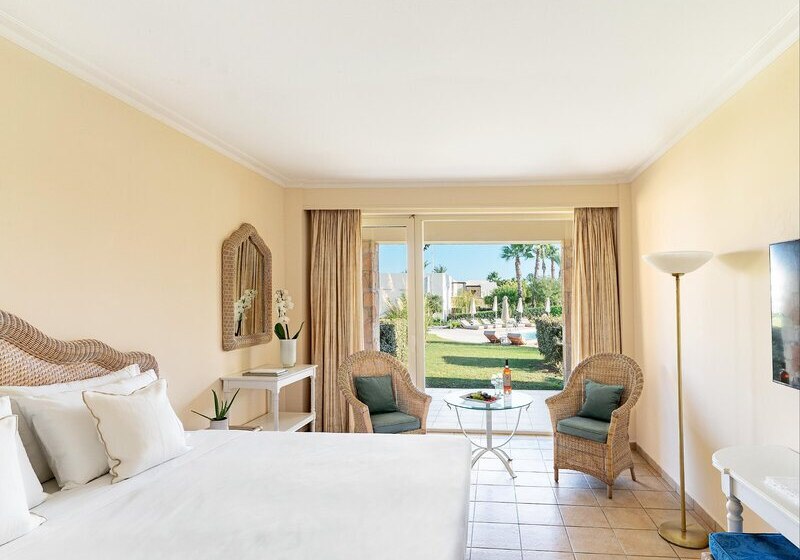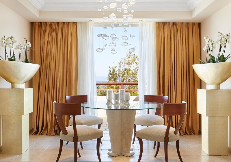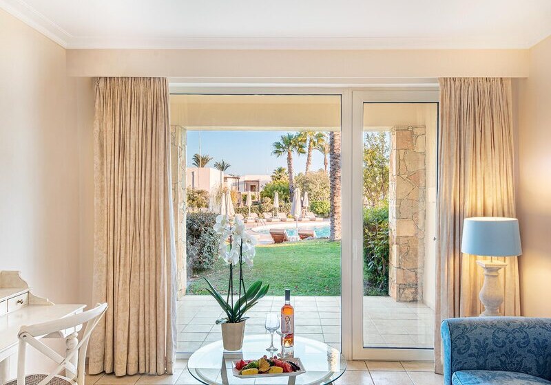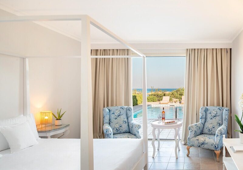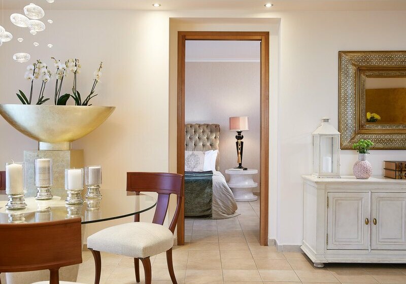 Was Euren Aufenthalt prägt, sind die Wahlmöglichkeiten: sechs Restaurants mit Buffet, Showcooking und À-la-carte-Küchen von griechisch über italienisch bis panasiatisch, dazu fünf Bars von der Lobby bis zum Strand. Shops wie Juwelier und Minimarkt, ein Friseur sowie kostenlose Parkplätze und eine 24-Stunden-Rezeption ergänzen die Infrastruktur. Die Zimmerauswahl reicht von Familienzimmern mit separaten Schlafbereichen bis zu Bungalows, teils mit privatem Pool, und Suiten mit Meerblick – jeweils mit Balkon oder Terrasse, Espressomaschine und durchdachten Annehmlichkeiten für unbeschwerte Tage in den Ferien.