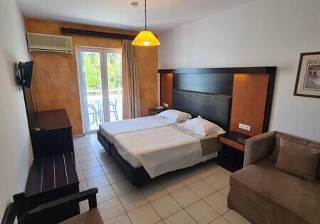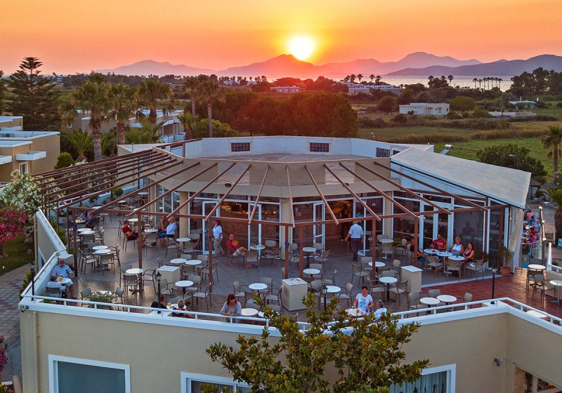 Die Atmosphäre ist ungezwungen, mit klarer Ausrichtung auf Paare und Familien, die kurze Wege schätzen. In 400 Metern seid Ihr am Tigaki Beach, das touristische Zentrum liegt rund 2 Kilometer entfernt. Kulinarisch werdet Ihr im Restaurant, an der Snackbar und an der Poolbar versorgt – auf Wunsch auch mit All-Inclusive. Abends bringt Live-Musik angenehme Bewegung in den Tag, wer mag, wählt danach die ruhige Ecke im Garten oder den TV-Raum.