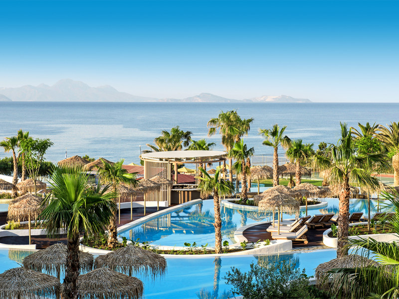 Im Mitsis Norida erlebt Ihr ein mediterranes Strandresort mit klarer Ausrichtung: entspannt am Meer, aktiv am Wasserpark, gesellig am Abend. Das Resort liegt am Hang des Berges Dikeos und öffnet sich direkt zu einem langen Kiesstrand. Weitläufige Poollandschaften, mehrere Bars und gepflegte Gartenbereiche schaffen Raum für Paare, Familien und Freundeskreise, die in den Ferien zwischen Ruhe und Programm wechseln möchten.