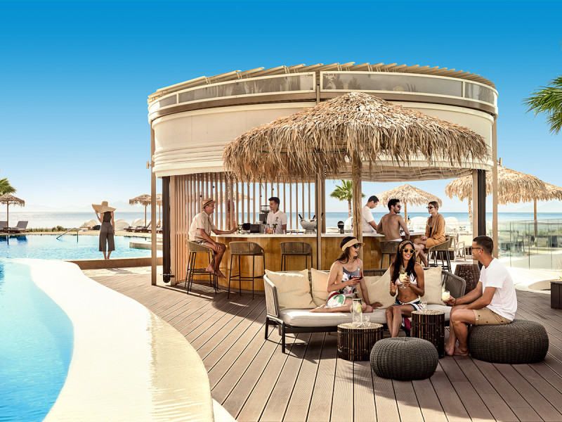 - Am Strand: Liegen, Schirme und Strandbar direkt an der Küste.