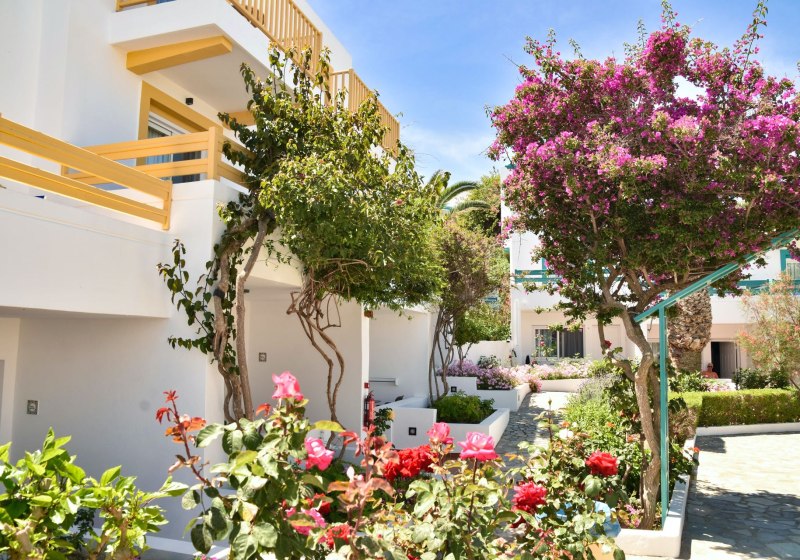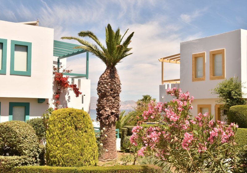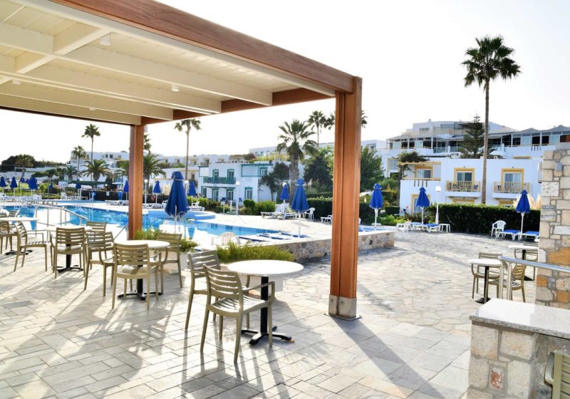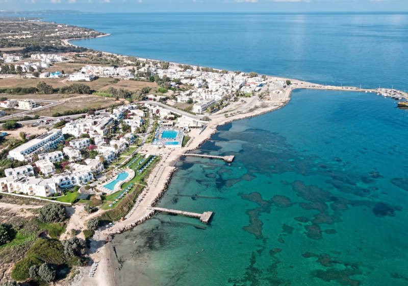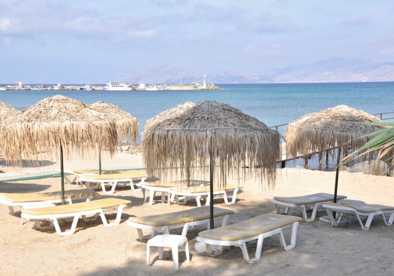 Ihr wohnt direkt am Strand von Mastichari auf Kos, mit zwei Badebuchten und zwei kleinen Stegen, die den Einstieg ins Meer erleichtern. Das traditionelle Fischerdorf erreicht Ihr nach etwa 200 Metern – nah genug für einen Spaziergang zu Tavernen, Bars und kleinen Geschäften. Eine Linienbushaltestelle liegt unmittelbar vor dem Hotel, was Eure Wege unkompliziert macht.
