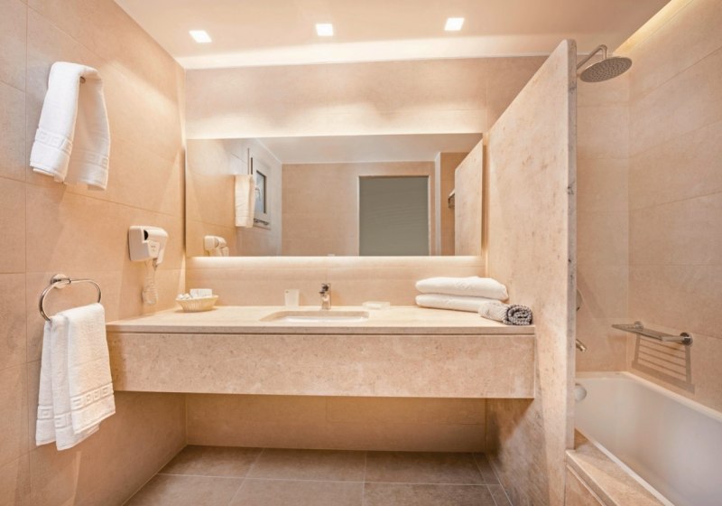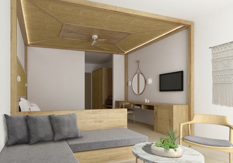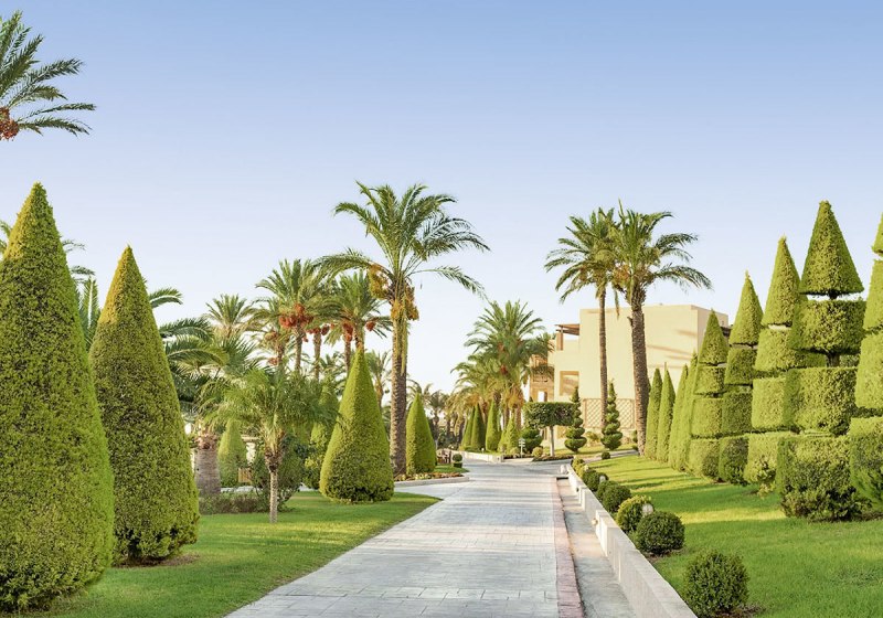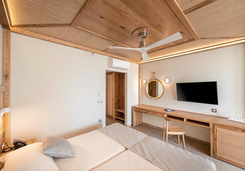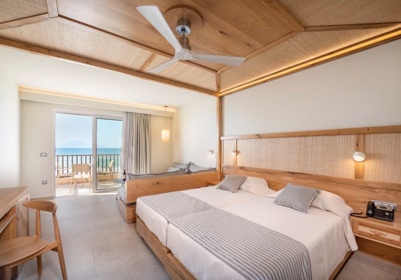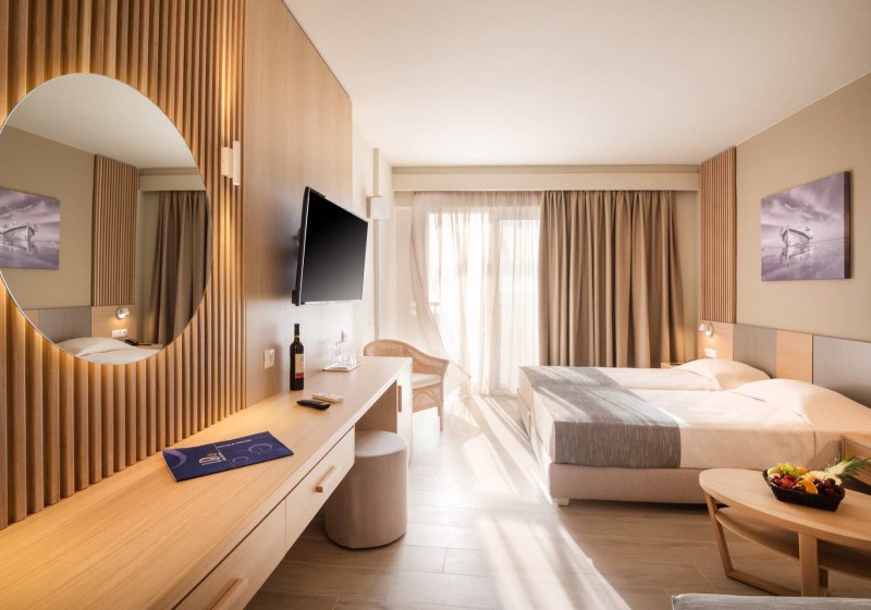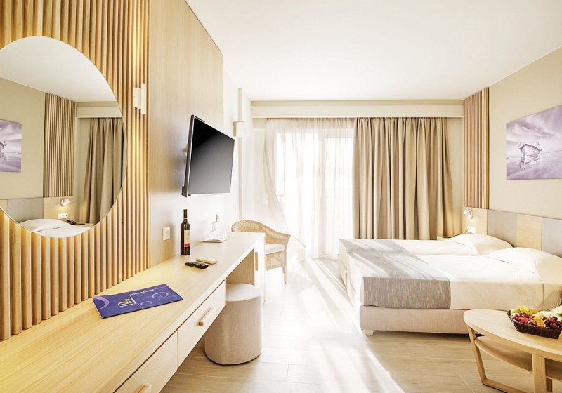 Eure Zimmer sind funktional ausgestattet: Bad/WC, Föhn, Telefon, Sat-TV, Kühlschrank, Mietsafe und Klimaanlage gehören zur Grundausstattung, dazu Balkon oder Terrasse. Die Gestaltung variiert je nach Gebäude; im neueren Teil bieten Superior-Doppelzimmer eine Walk-in-Dusche für einen modernen Duschkomfort. Ausgewählte Einheiten erlauben Meer- oder Gartenblick, passend zu Eurem Tagesrhythmus zwischen Strand und Pool.