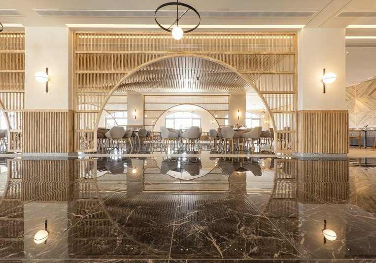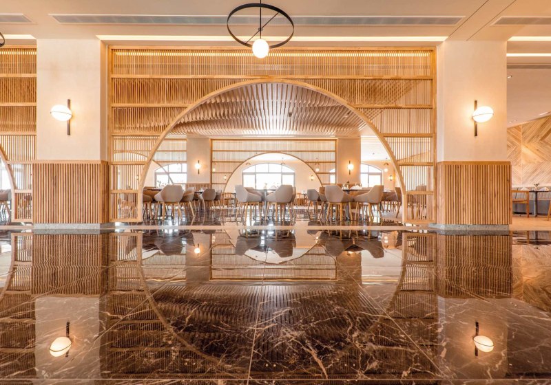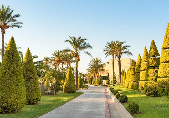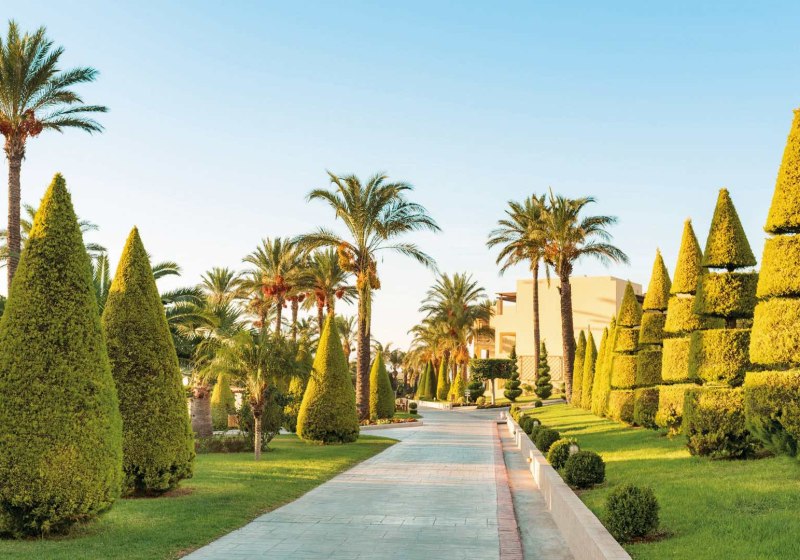 Die Anlage gliedert sich in ein Haupthaus und mehrere zwei- bis dreistöckige Bungalowgebäude. Zentral liegen Lobby und 24-Stunden-Rezeption, WLAN ist inklusive. Weitläufige Gärten umrahmen vier Süßwasser-Poollandschaften mit separaten Kinderpools. Liegen, Sonnenschirme und Badetücher sind am Poolbereich vorgesehen; entlang der Wege findet Ihr Terrassen, Außenmöbel und ruhige Sitzflächen.