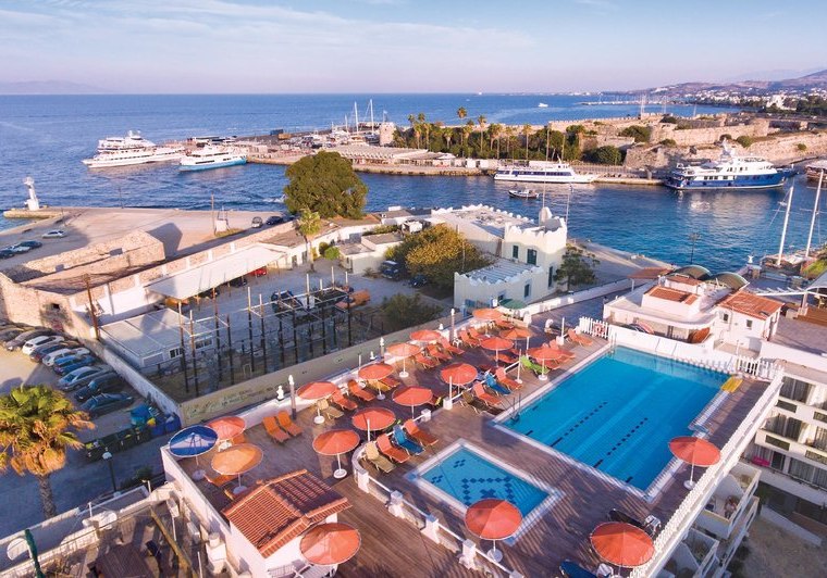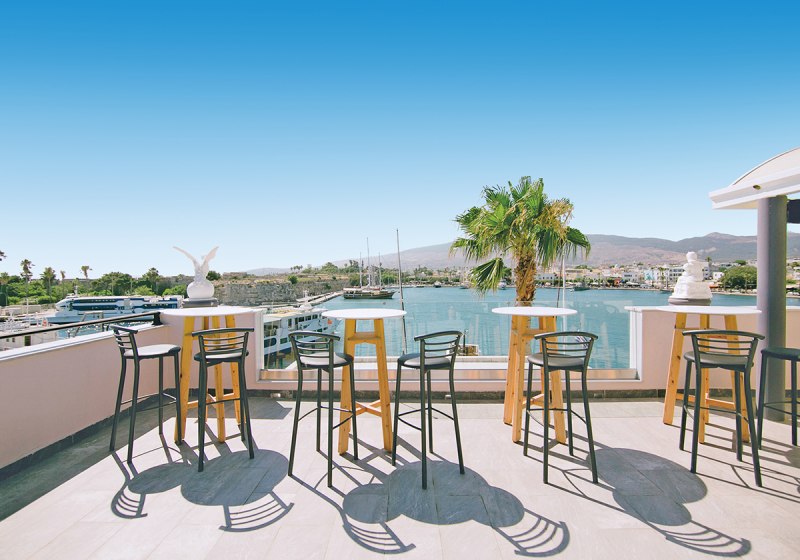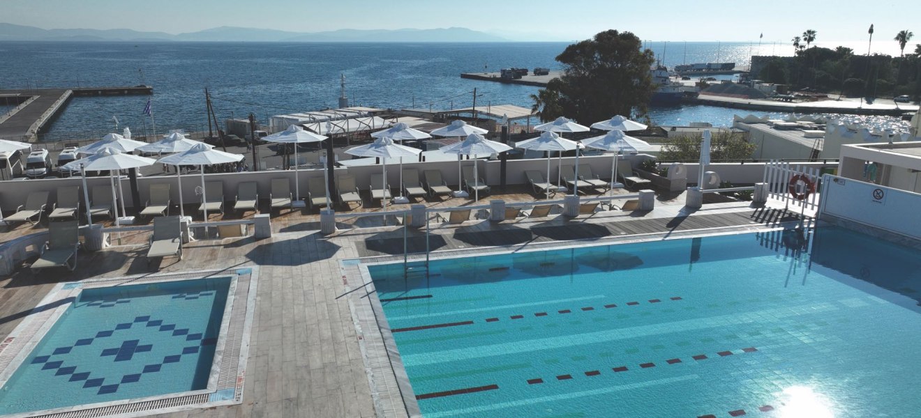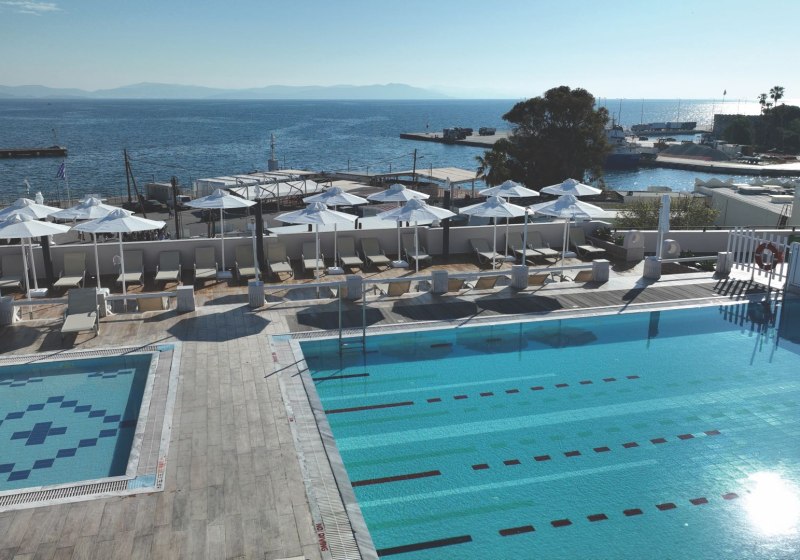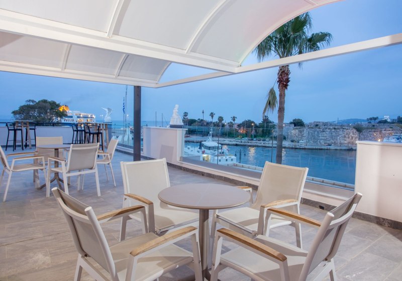 Im Kosta Palace City Hotel wohnt Ihr direkt am Hafen von Kos, mit freiem Blick auf die Johanniterfestung. Die Dachterrasse mit Pool und weitläufiger Sonnenterrasse wird schnell zum Lieblingsplatz, wenn Ihr zwischen Stadtflair und Meerblick abschalten wollt. Klare Linien, kurze Wege und ein angenehm urbanes Gefühl prägen den Aufenthalt.