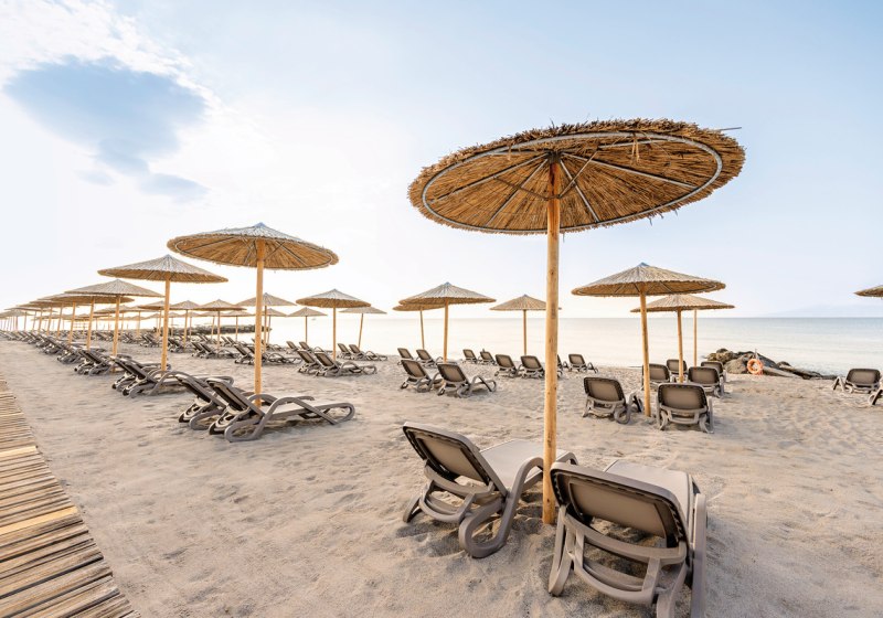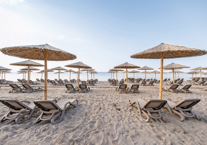 - Strandsetup: Liegen, Schirme und Snackversorgung direkt am Meer.