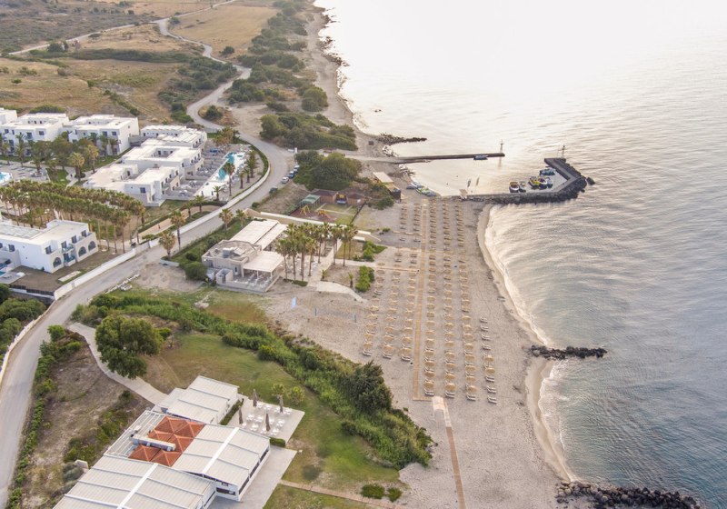 Ihr wohnt an der Südküste von Kos, am Strand von Kardamena – nur die ruhige Zufahrtsstraße trennt Euch, eine Unterführung führt direkt hinunter. Der Strand ist lang und flach abfallend, mit teils kieseligen Abschnitten. Bis nach Kardamena sind es etwa 3 Kilometer; dort findet Ihr Hafenflair und zusätzliche Ausgeh- und Einkaufsoptionen. Kos-Stadt liegt rund 30 Kilometer entfernt, der Flughafen etwa 9 Kilometer. Durch die Nähe können gelegentlich Fluggeräusche auftreten. Vor Ort genießt Ihr die Strandlage mit Liegen und Schirmen sowie die bequeme Erreichbarkeit der Inselpunkte per Mietwagen, Velo oder Transfer. Das Ambiente ringsum bleibt strandorientiert und unkompliziert – perfekt, wenn Ihr kurze Wege vom Zimmer zum Meer schätzt.