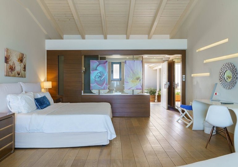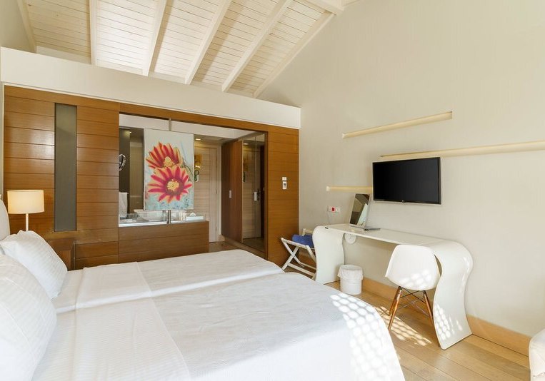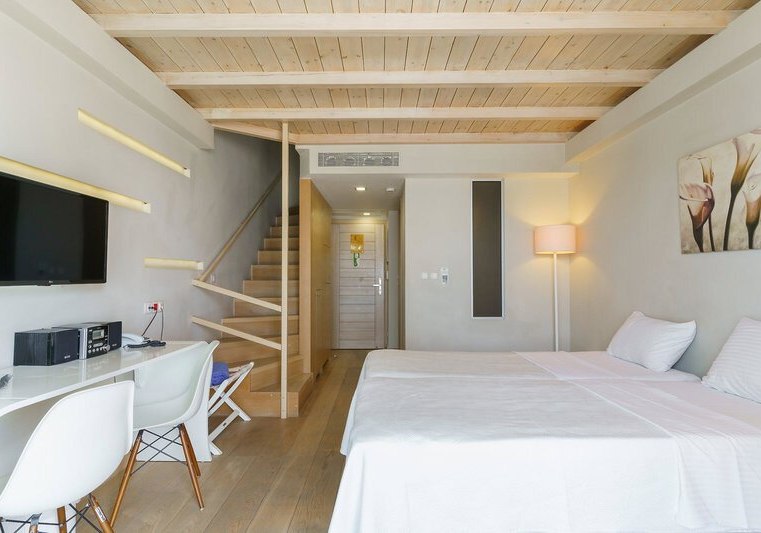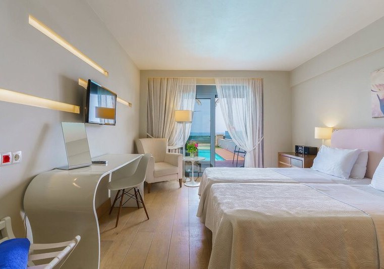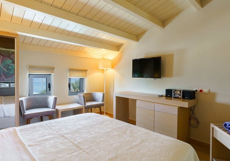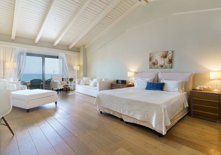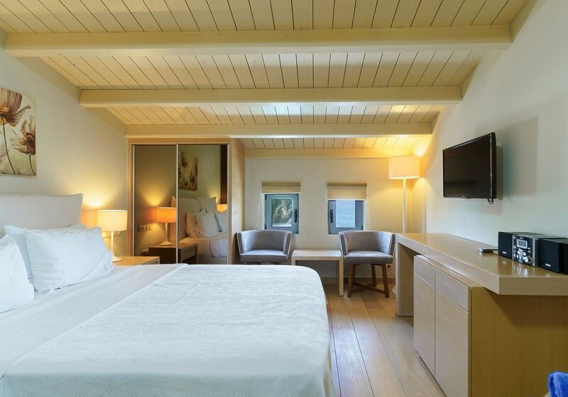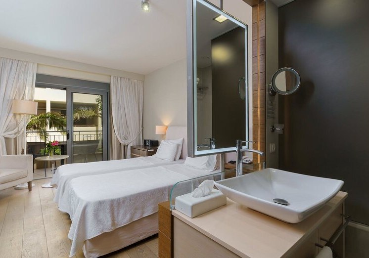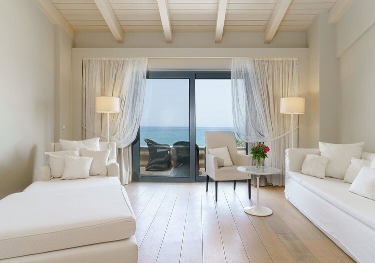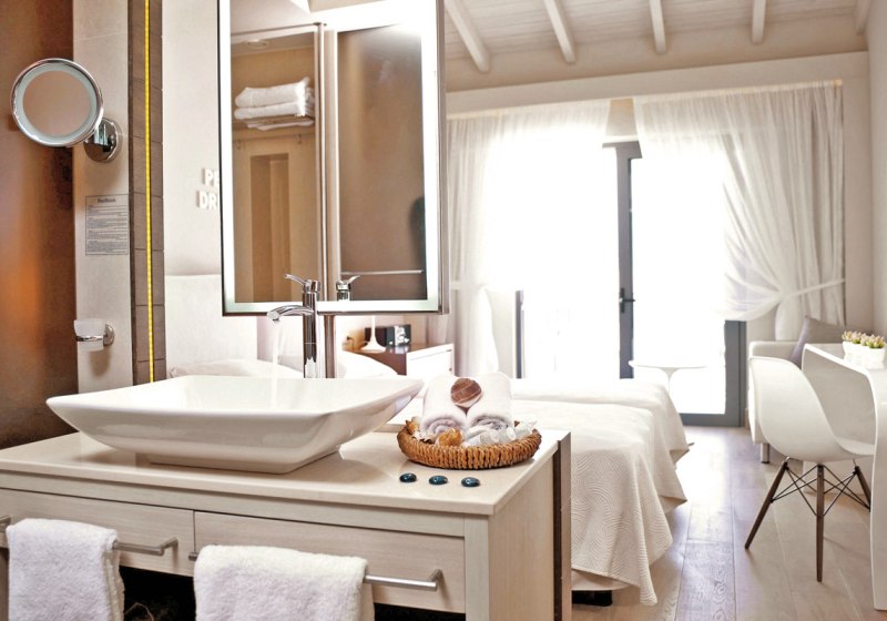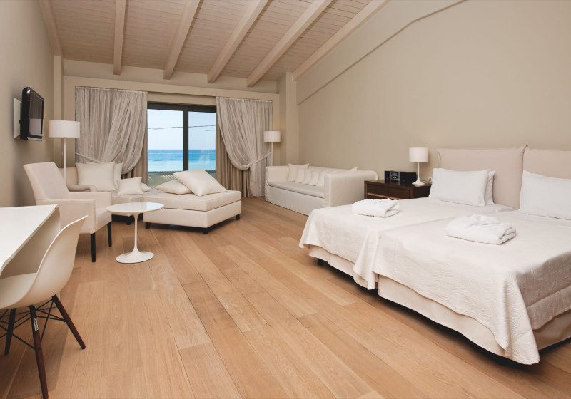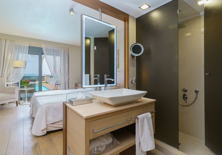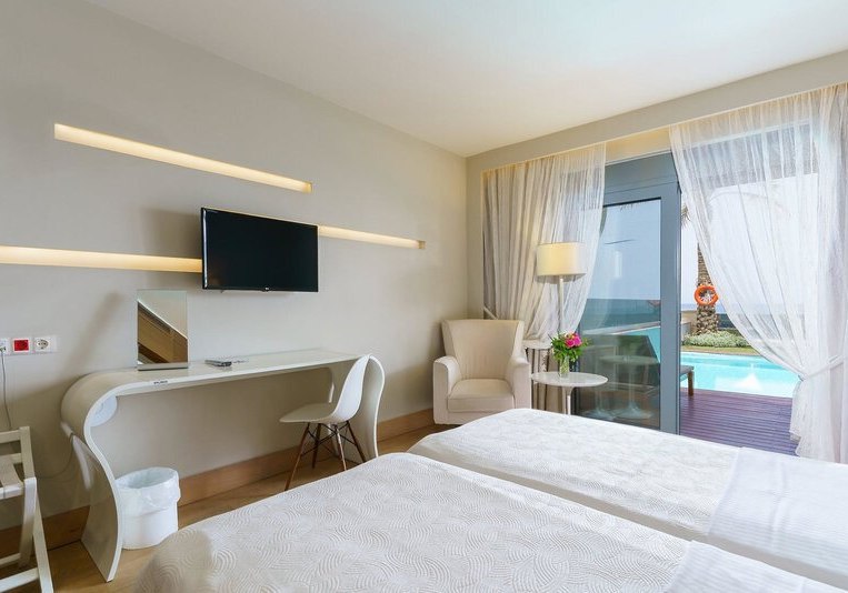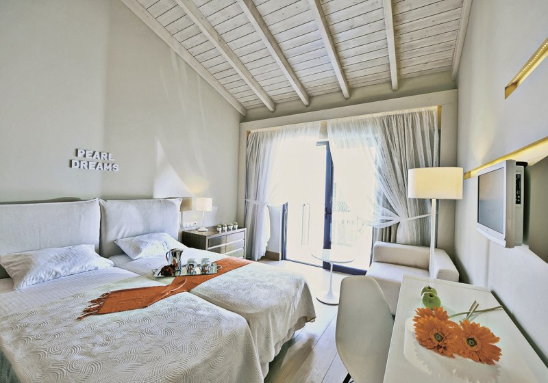 Ihr wählt zwischen Zimmern mit seitlichem Meerblick oder Poolblick, der Maisonette mit separatem Schlafzimmer und zweitem Bad, dem Deluxe Zimmer mit privatem Pool oder der Suite mit Meerblick, Hydromassage‑Badewanne und separater Dusche. So findet Ihr die passende Balance aus Raum, Blick und Privatsphäre.