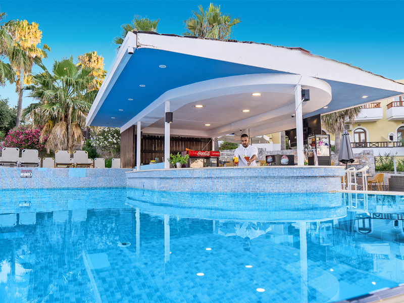 Die öffentliche Bereiche wirken übersichtlich, mit 24‑h‑Rezeption, Lobby-Lounge und WLAN in allen Bereichen. Am Pool wartet die Snackbar auf den kleinen Hunger zwischendurch, im Restaurant stärkt Ihr Euch zu den Hauptmahlzeiten. Mit zentraler Lage in Almyrida und dem Sandstrand in erreichbarer Nähe verknüpft Ihr Badetage, leichte Aktivitäten und unkomplizierte Erholung in den Ferien. Highlight: Wasserpark mit Rutschen für alle Altersgruppen, direkt im Hotelgelände.