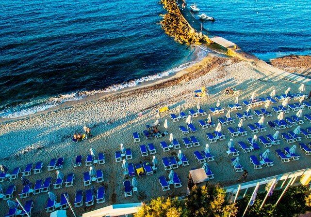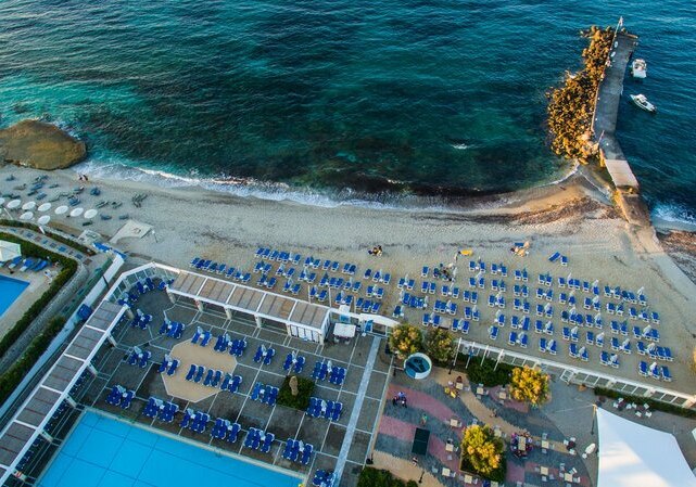 - Strandsetup: Liegen, Schirme, Badetücher und Beach‑Bar direkt am Meer.