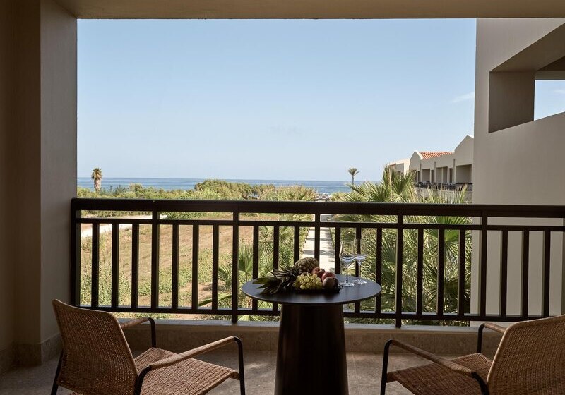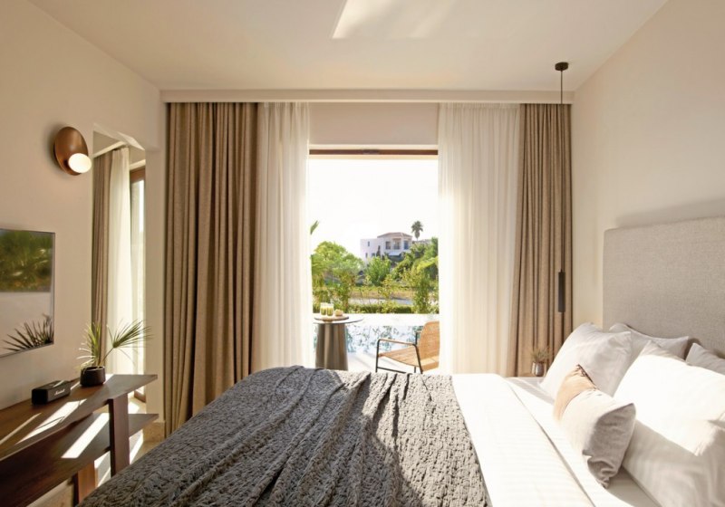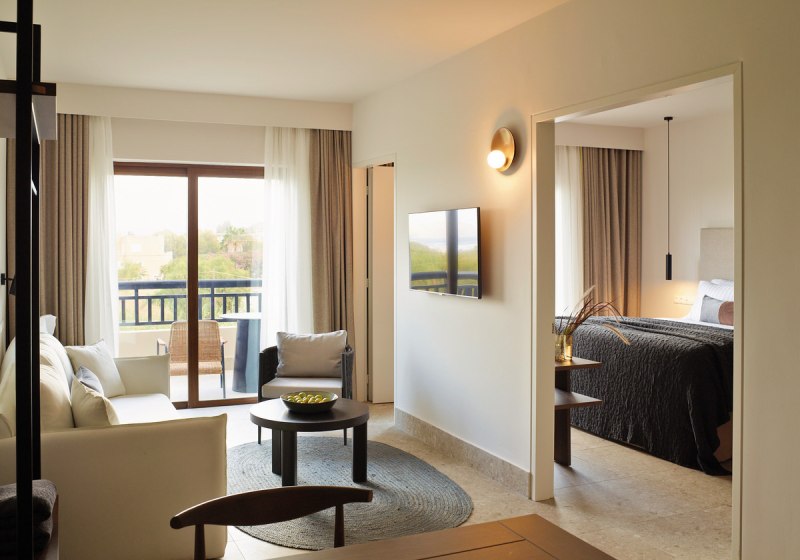 Ihr wählt zwischen Zimmern mit Balkon oder Terrasse und Blickvarianten bis hin zum Meer- oder Gartenblick. Zur Ausstattung gehören Doppelbett, Schlafsofa, Dusche/WC, Pflegeprodukte, Bademäntel, Hausschuhe, Föhn sowie individuell regulierbare Klimaanlage. LED-Sat-TV, WLAN, Safe, Minibar, Kaffee-/Teezubereiter und Espressomaschine runden den Komfort ab. Highlight: Suiten-Optionen mit direktem Poolzugang oder privatem Pool.