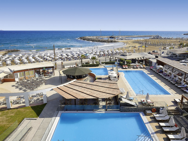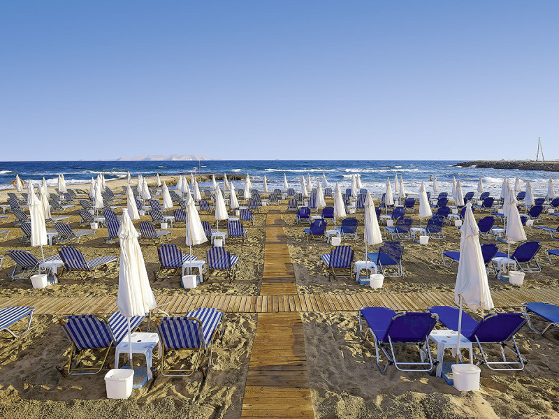 Das Hotel liegt in Gouves auf Kreta, rund 30 Meter vom Sandstrand entfernt. Bis zum Flughafen Heraklion sind es etwa 17 Kilometer. Ihr erreicht das Stadtzentrum nach circa 700 Metern, Bars liegen bei rund 300 Metern, ein Club bei etwa 500 Metern. Am Strand erwarten Euch Liegestühle, Sonnenschirme und eine Strandbar.