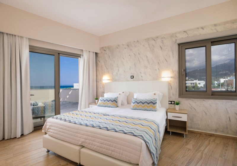 Juniorsuiten kombinieren offenes Schlafzimmer, Sitzecke und Küche – ideal, wenn Ihr kompakt wohnen und selbst zubereiten möchtet. Apartments bieten ein separates Schlafzimmer, Suiten setzen mit zwei Schlafzimmern, zwei Bädern, Whirlpool und Meerblick einen spürbaren Komfortakzent.