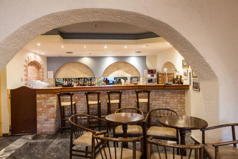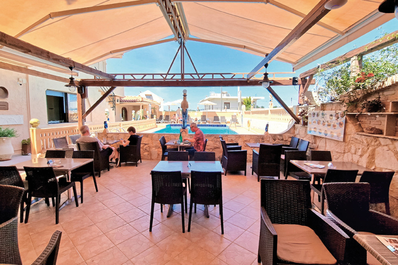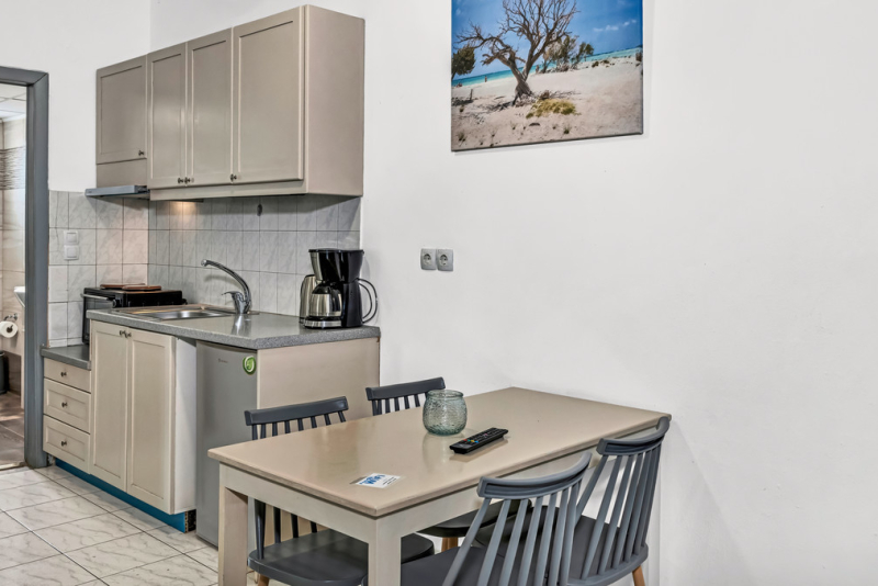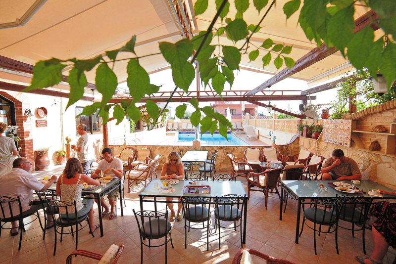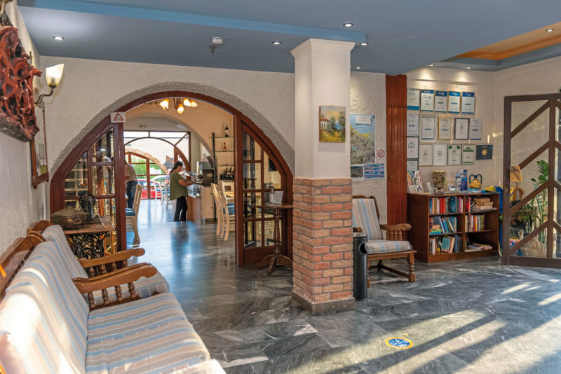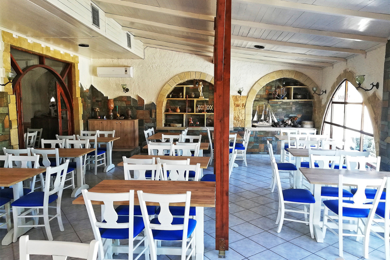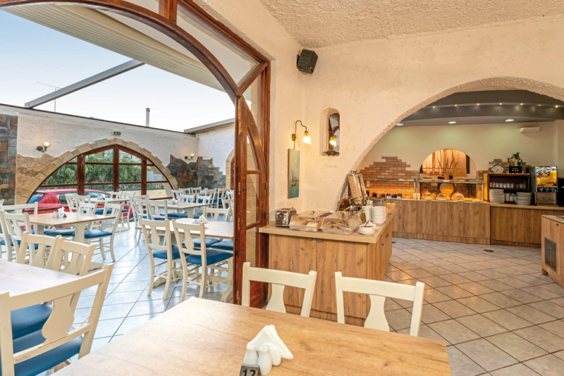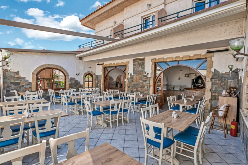 Das Hotel verfügt über ein Restaurant, das griechische und internationale Küche serviert. Es bietet sowohl Buffet als auch à-la-carte-Optionen. Besondere Events wie kretische Themenabende mit Barbecue und Live-Musik sind gegen Aufpreis möglich. Die Halbpension umfasst Frühstück und Abendessen.