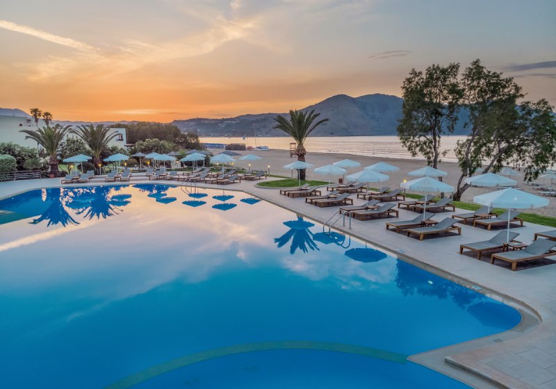 Im Pilot Beach Resort wohnt Ihr in einem weitläufigen Resort direkt am langen Sandstrand von Georgioupolis. Zwei Bereiche sind über eine Unterführung verbunden – so bewegt Ihr Euch bequem zwischen Gärten, Pools und der hoteleigenen Strandzone. 2021 umfassend renoviert, wirkt die Anlage klar strukturiert und gepflegt. Familien profitieren von kindgerechten Angeboten, Strandliebhaber von kurzen Wegen und reichlich Platz am Wasser.