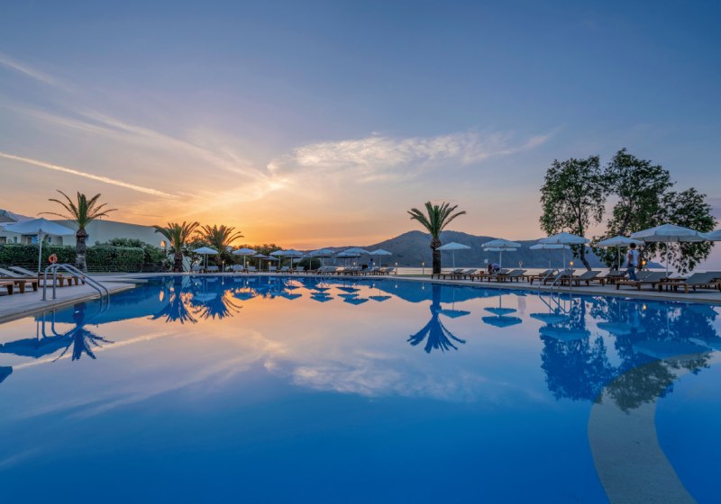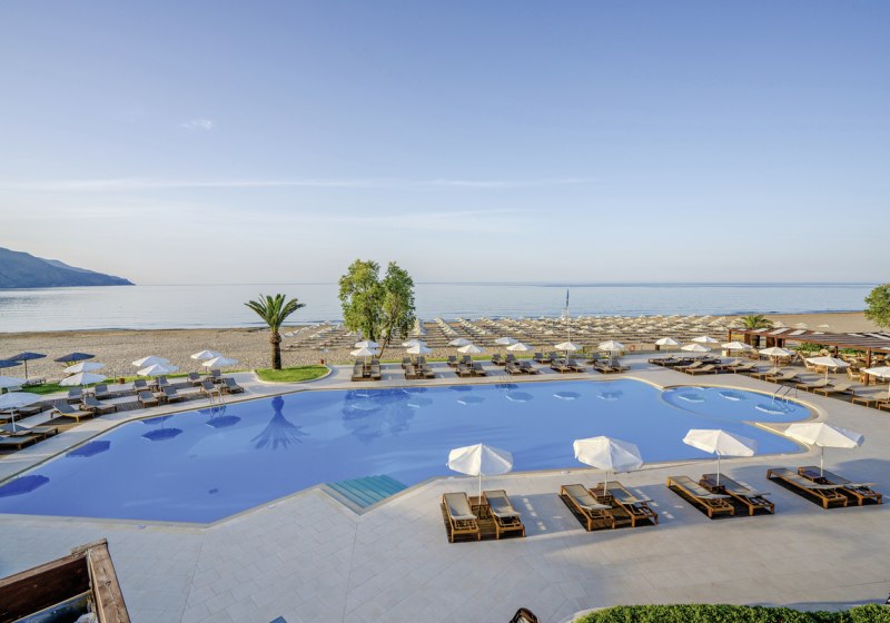 Vier Süßwasserpools verteilen sich über das Gelände, dazu ein Kinderpool mit Rutschen bis acht Jahre. Kulinarisch erwartet Euch ein Mix aus Buffet mit Show-Cooking, griechischem Themenrestaurant mit italienischer Ecke und einem Strandrestaurant – begleitet von Bars mit Terrasse und Livemusik an der Strandbar. Das Ambiente bleibt tagsüber entspannt und aktiv, abends unterhaltsam mit täglicher Animation, Open-Air-Kino und ruhigen Ecken in den Gärten. Highlight: Direkte Strandlage mit eigener Zone und kurzen Wegen zwischen Strand, Pools und Gärten.