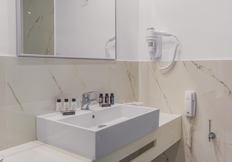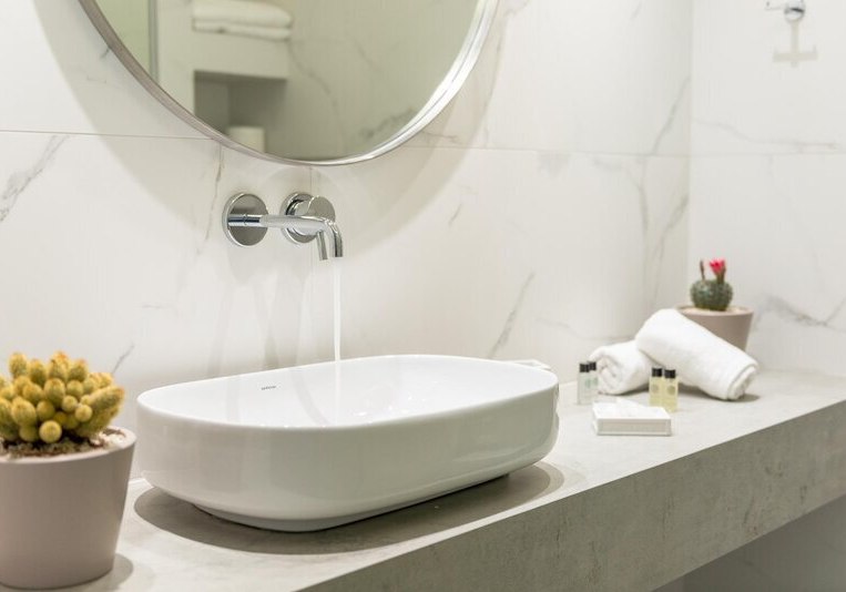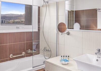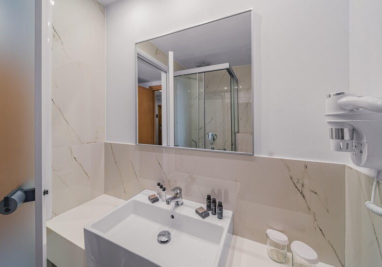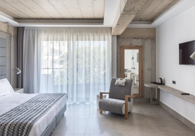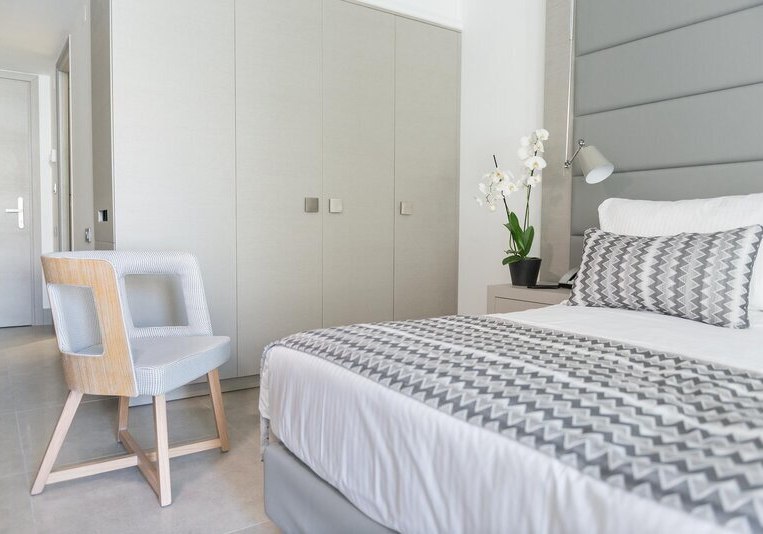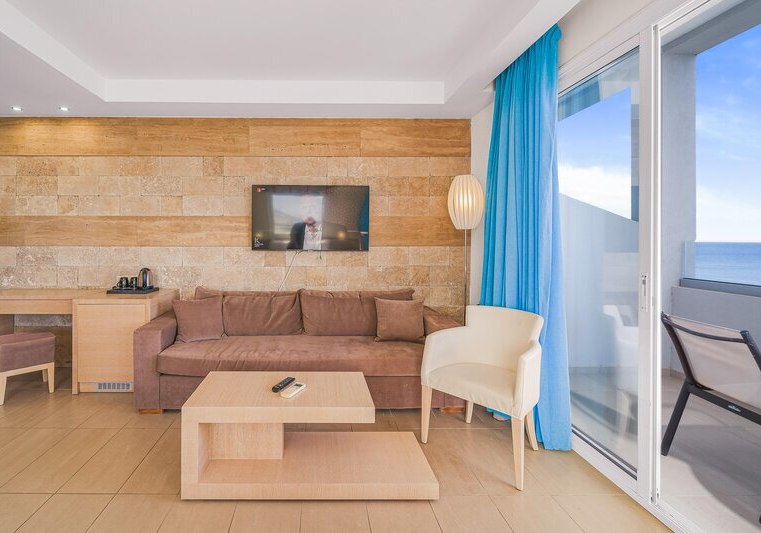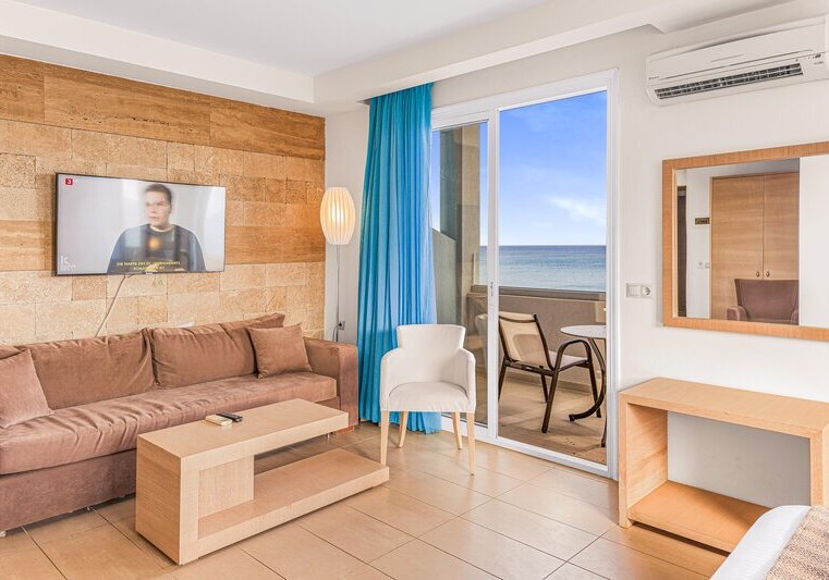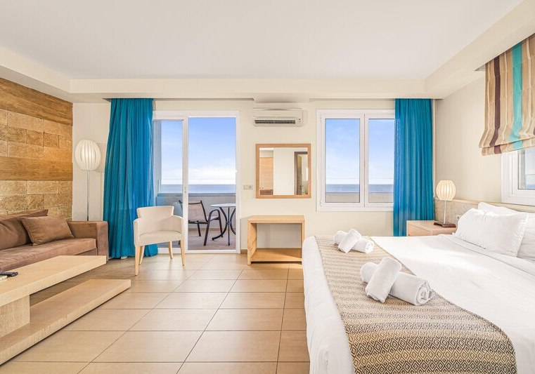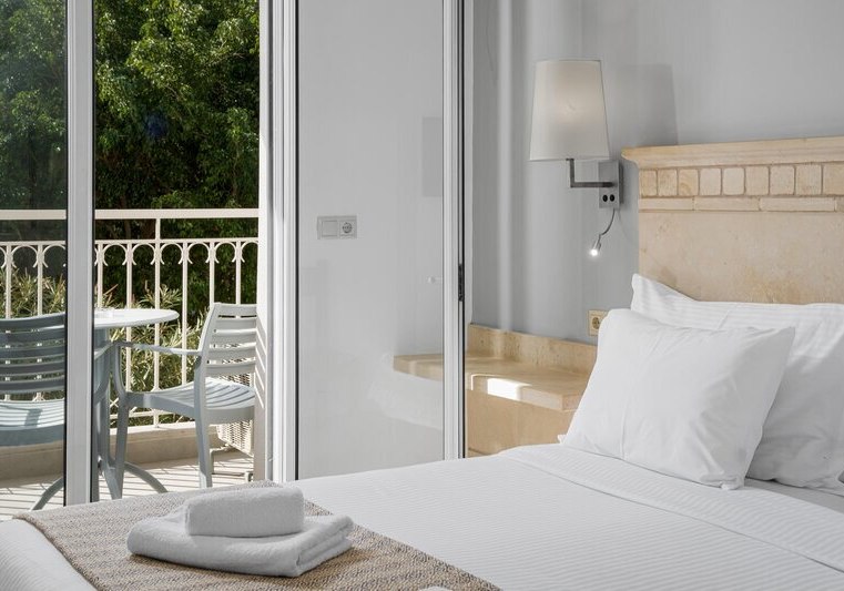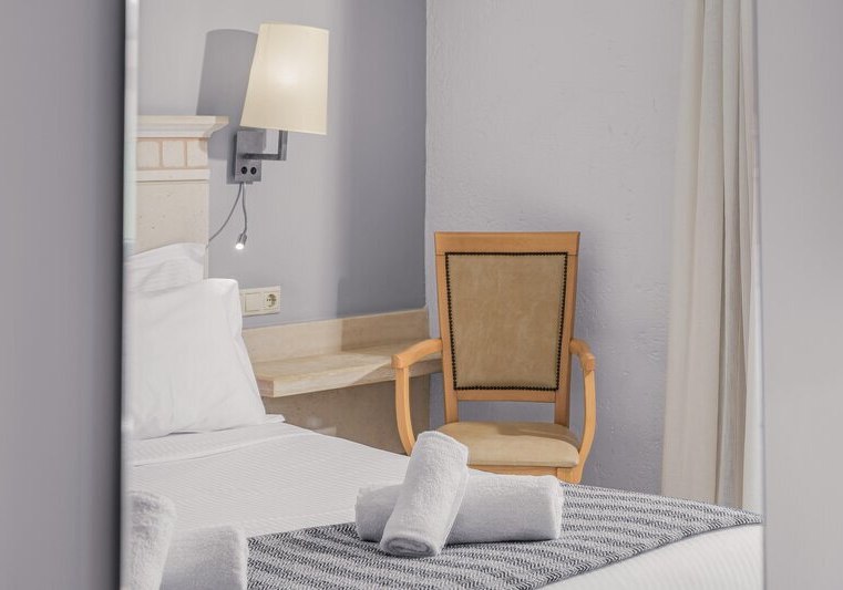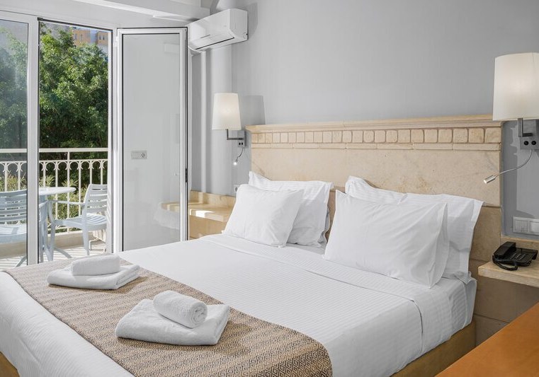 Die 164 Wohneinheiten verteilen sich auf sechs Etagen im Hauptgebäude und ein Nebengebäude (ca. 3 Minuten zu Fuss). Es gibt 158 Doppelzimmer und 6 Junior‑Suiten. Ihr wählt zwischen Balkon oder Terrasse, Ausblicken bis hin zu Meer- oder Gartenblick und, je nach Kategorie, Bad mit Dusche oder Badewanne (in Superior).