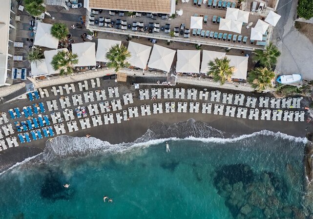 Im Glaros Beach Hotel wohnt Ihr direkt an Strand und Promenade von Chersonissos. Das Haus wurde 1976 erbaut und 2022 renoviert, wirkt heute klar strukturiert und angenehm zeitgemäss. Die Atmosphäre ist lebhaft entlang der Uferlinie und zugleich fokussiert auf kurze Wege: vom Lobbybereich auf die Sonnenterrasse, von dort zum Süsswasser-Aussenpool oder über wenige Schritte an den Strand.
