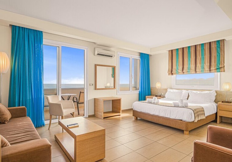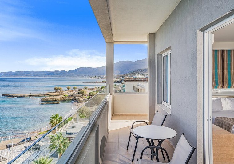 Zimmer mit Balkon oder Terrasse, Meerblick‑Optionen, Fitness, Tauchen sowie ein kompaktes Wellness‑Center runden das Bild ab. Für Paare, Strandurlauber, Singles und Kurzentschlossene eignet sich das Haus als klare, bequeme Basis für die Ferien auf Kreta.
