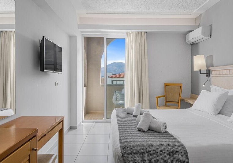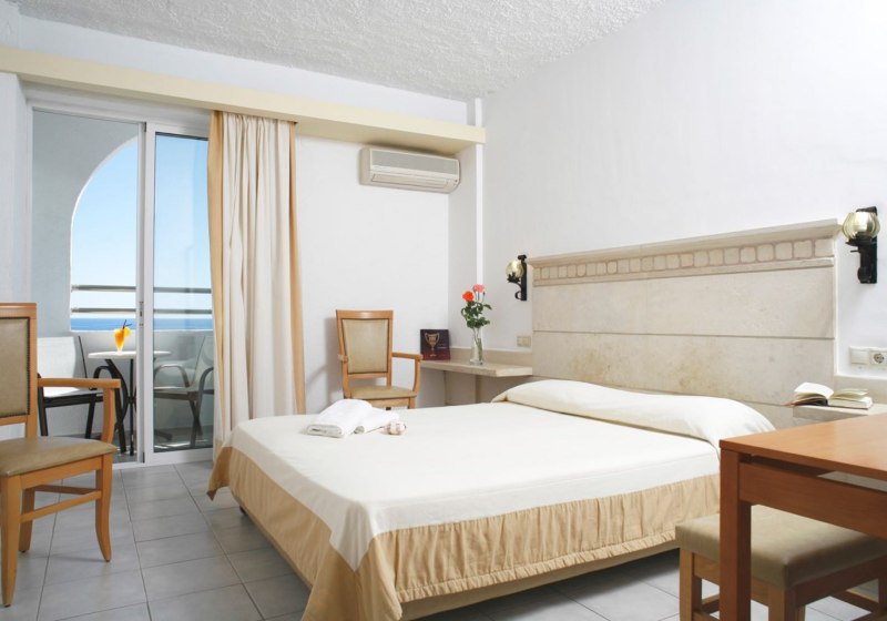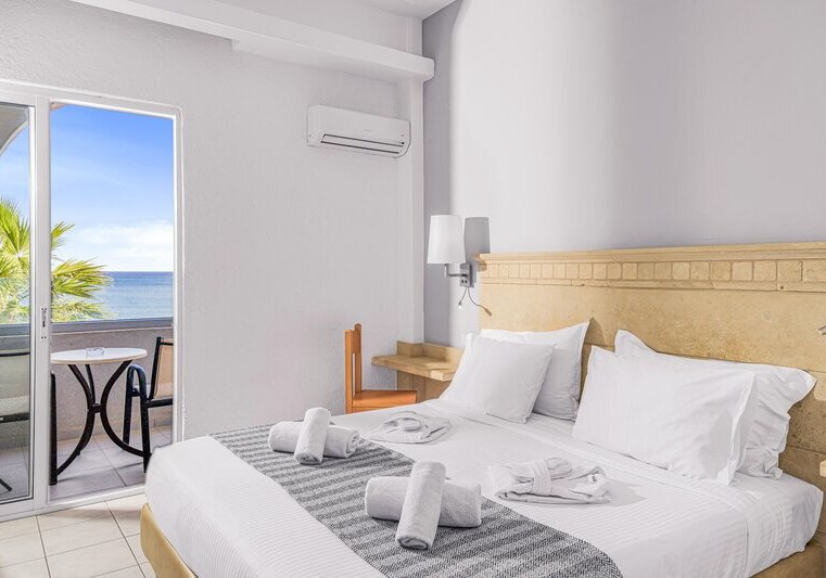 Zur Ausstattung zählen individuelle Klimaanlage, Sat‑TV, Telefon, Minikühlschrank, Safe, Haartrockner sowie teilweise Kaffee‑/Teezubereiter und Wasserkocher. Zustellbett und Kinderbett sind verfügbar, einige Zimmer bieten Sitzecke. Internetzugang und WiFi werden ausgewiesen. Highlight: Renovierte Zimmer mit Meerblick‑Option verbinden Lagevorteil und Komfort.