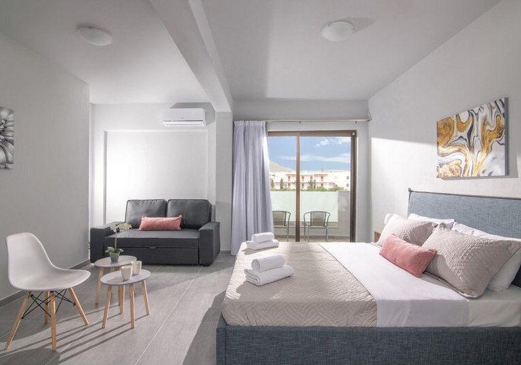 Die Lage verbindet Ruhe und Anbindung: Rund 700 Meter trennen Euch vom Sandstrand, was einen angenehmen Spaziergang bedeutet. In die Nachbarschaft streut Ihr mit kurzen Wegen – der Supermarkt liegt etwa 150 Meter entfernt, Bars und Restaurants erreicht Ihr nach rund 400 Metern. Mit der Bushaltestelle in nur circa 50 Metern seid Ihr flexibel unterwegs und erreicht die Region ohne Aufwand. Für Ausflüge bieten sich Hersonissos in etwa 8 Kilometern, Malia in rund 18 Kilometern und Heraklion in circa 20 Kilometern an. Der Flughafen Heraklion (HER) liegt ungefähr 17 Kilometer entfernt, was die Anreise planbar macht. So verbindet Ihr Strandnähe, urbane Impulse und die Ruhe eines kompakten Standorts.