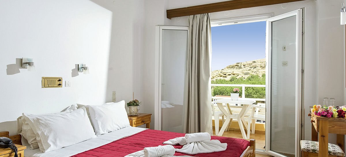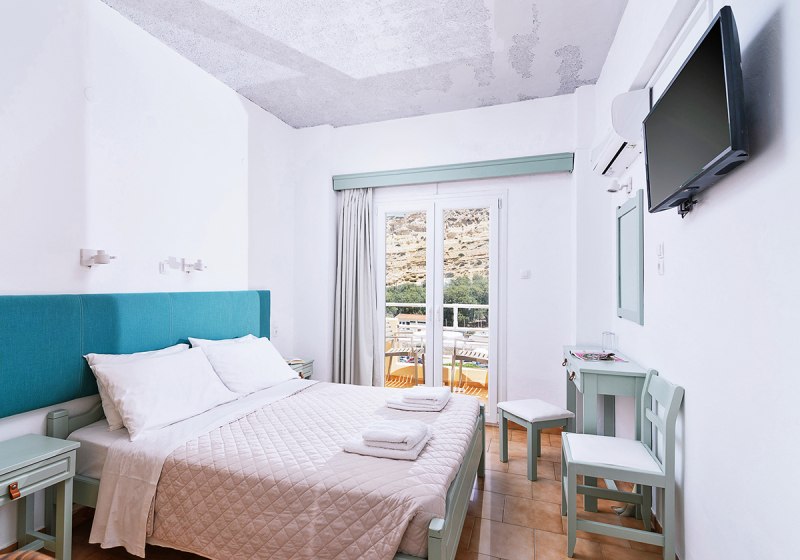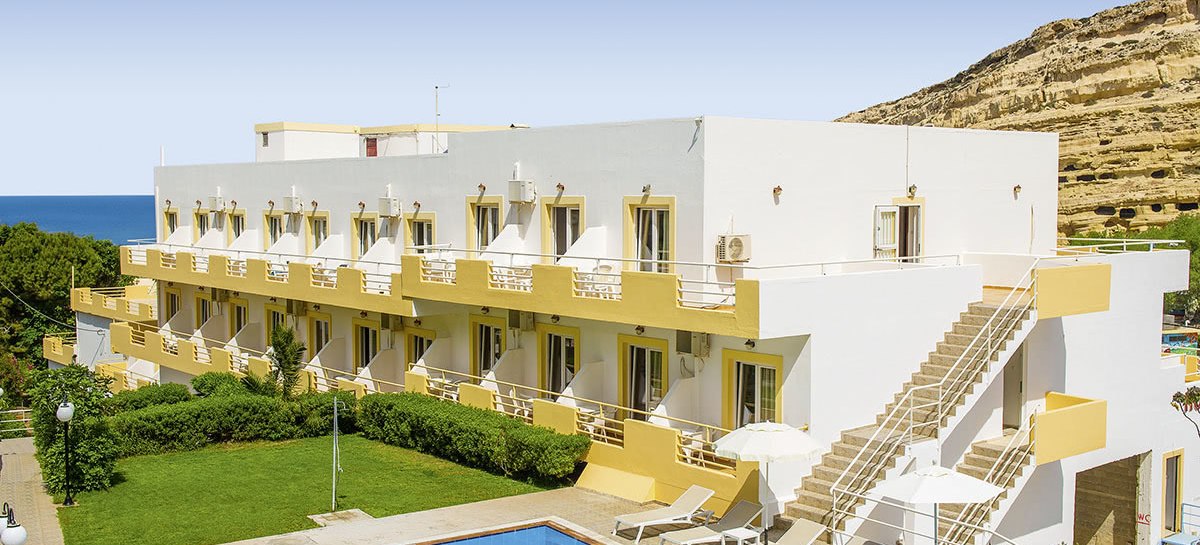 Hotel Zafiria empfängt Euch im Herzen von Matala auf Kreta – renoviert 2022, übersichtlich mit drei Etagen und 59 Zimmern. Ihr wohnt zentral und strandnah, mit kurzer Distanz zum goldenen Sand. Die Atmosphäre ist entspannt und unkompliziert: Lobby, TV-Raum und Sonnenterrasse bilden die Kulisse für ruhige Stunden zwischen Badegang und Bummel durch den Ort.