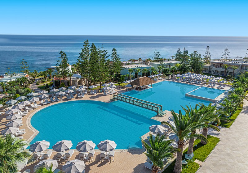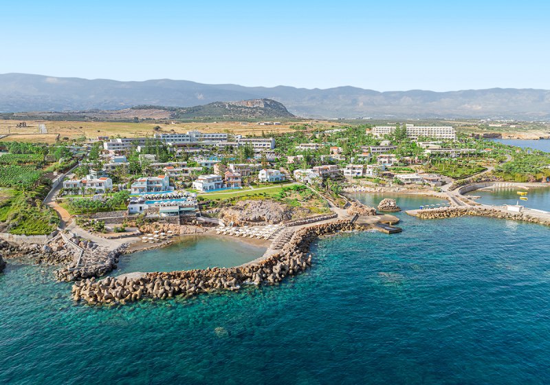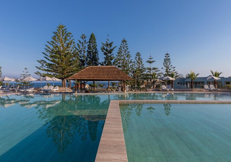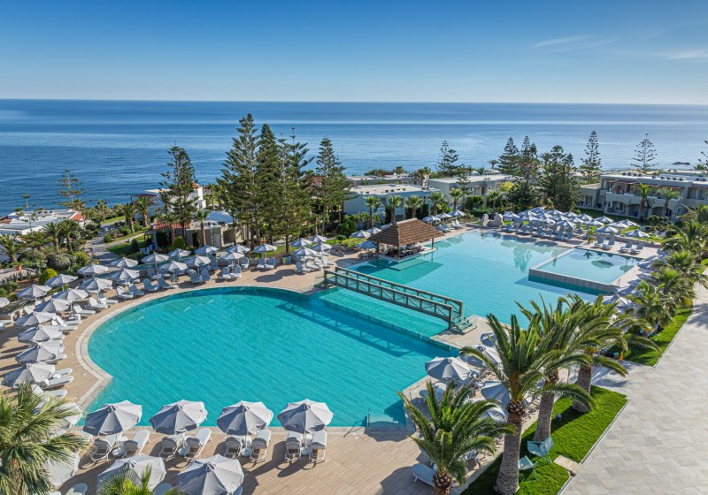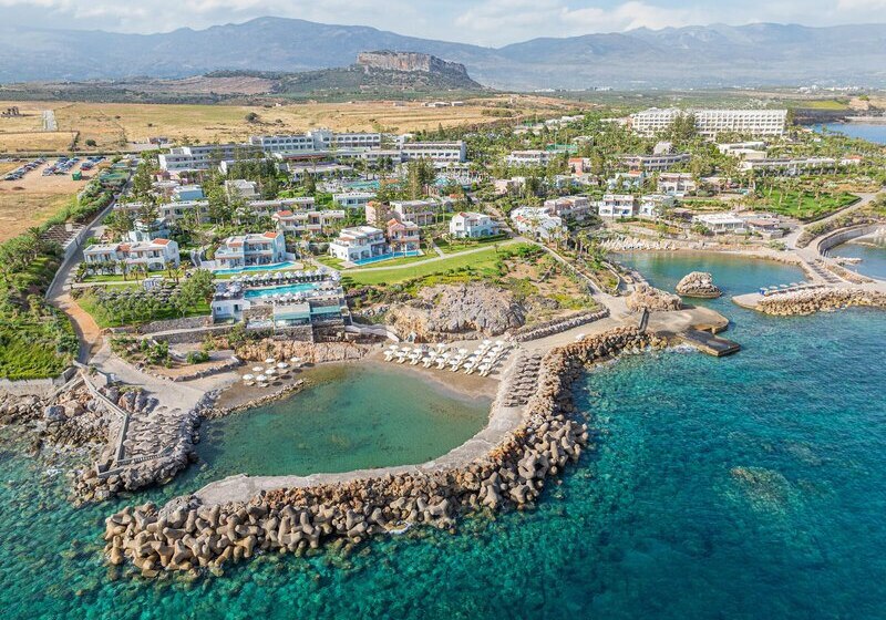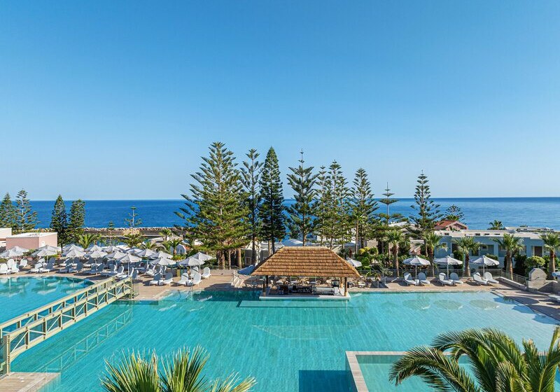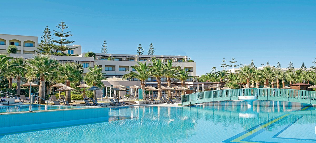 Im Iberostar Selection Creta Marine wohnt Ihr direkt an drei geschützten Sand-Kiesbuchten und bewegt Euch zwischen großzügigen Poolbereichen, ruhigen Ecken und lebendigen Treffpunkten. Die Architektur verteilt sich auf Hauptgebäude und Bungalows, was dem Gelände Weite gibt. Familien, Strandurlauber und Paare finden klare Strukturen, viel Service und kurze Wege zum Meer.