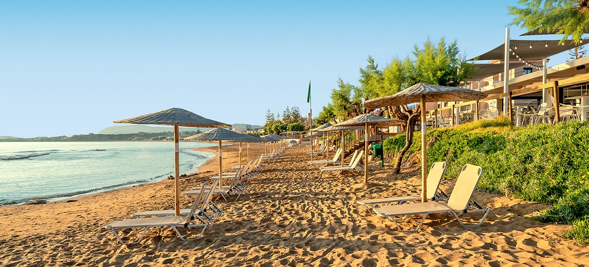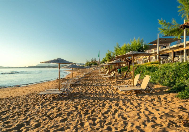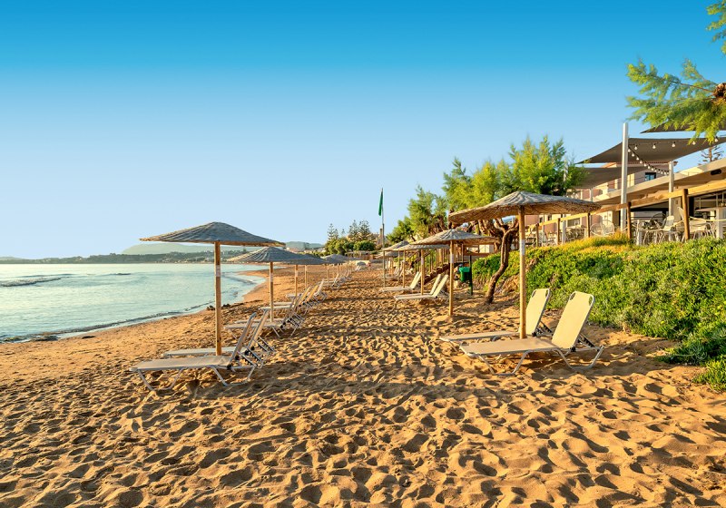 Agia Marina auf Kreta, direkt am Sandstrand: Hier wechselt Ihr in Sekunden zwischen Liege und Meer. Bis Platanias sind es etwa 1,5 Kilometer, Chania erreicht Ihr nach rund 8 Kilometern. Die Bushaltestelle liegt circa 100 Meter entfernt. Bars und Restaurants befinden sich in fußläufiger Umgebung. Der Flughafen Chania ist etwa 22 Kilometer entfernt.