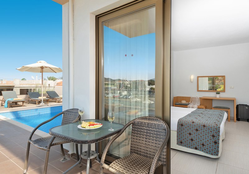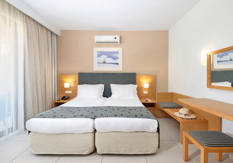 Studios liegen im Annex in zweiter Strandreihe, Apartments bieten ein separates Schlafzimmer mit Schiebetür. So bleibt der Wohnbereich flexibel nutzbar – praktisch für Familien oder längere Aufenthalte. Die tägliche Reinigung hält die Räume verlässlich in Schuss, sodass Ihr Euch auf Strand, Pool und Ausflüge konzentriert.