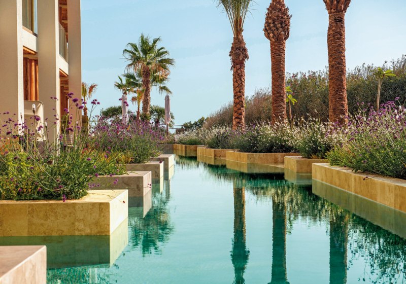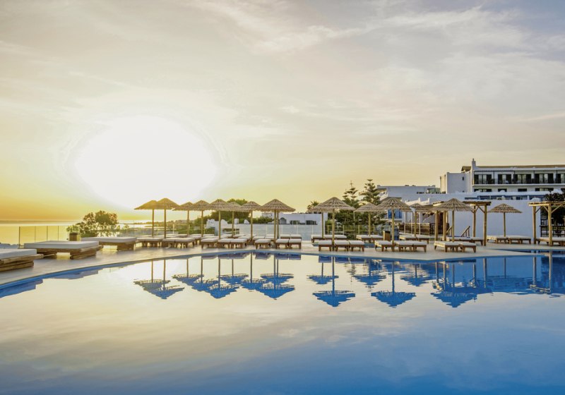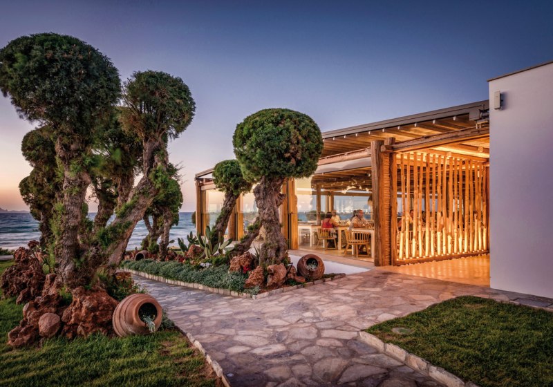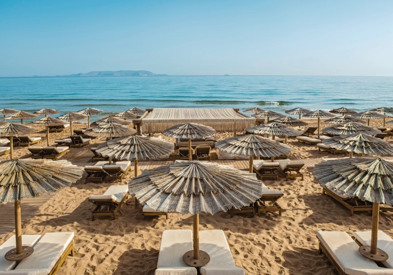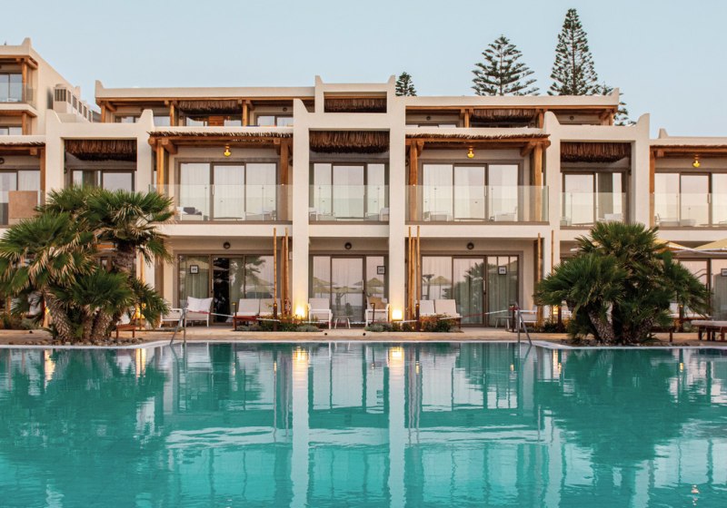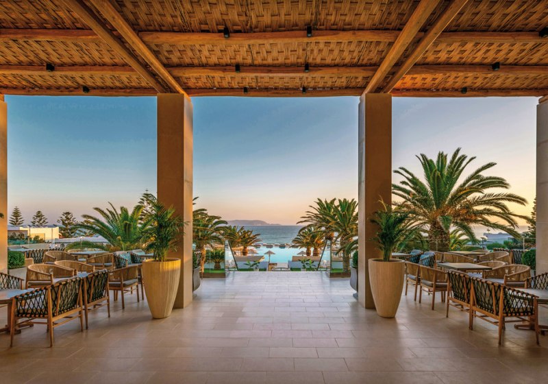 Mitsis Selection Rinela empfängt Euch direkt am Sandstrand von Kokkini Hani – ausgezeichnet mit der Blauen Flagge. Das Ensemble aus Haupthaus und Bungalowgebäuden wirkt wie ein kleines Dorf: Wege führen zu Terrassen, Gärten und mehreren Pools. Die Atmosphäre ist lebendig, ohne hektisch zu sein. Familien finden klare Strukturen, Paare Rückzugsorte wie den Adults-Only-Strandbereich. Mit Theatersälen, Bibliothek und Shoppingarkade fügt sich der Alltag komfortabel in den Ferienmodus.
