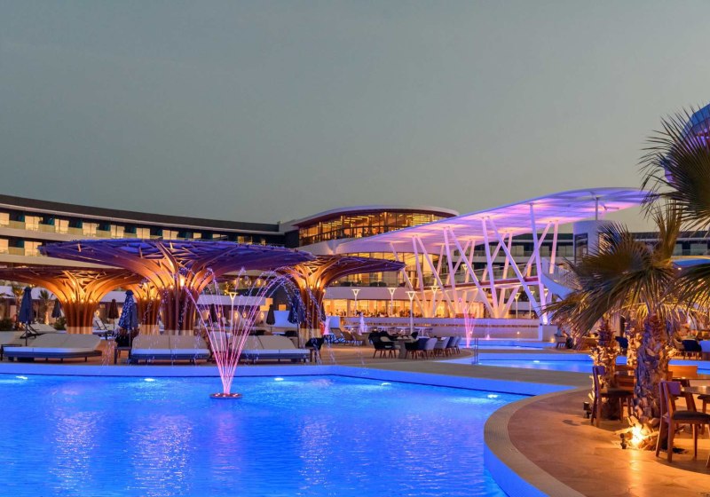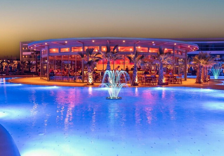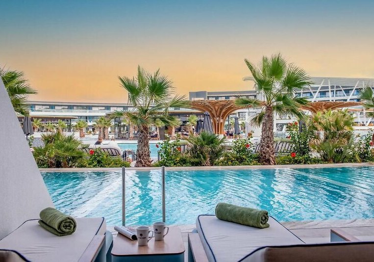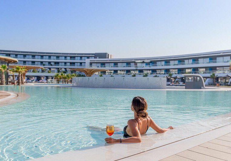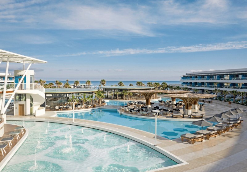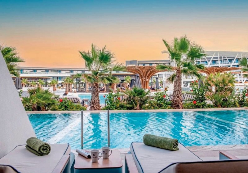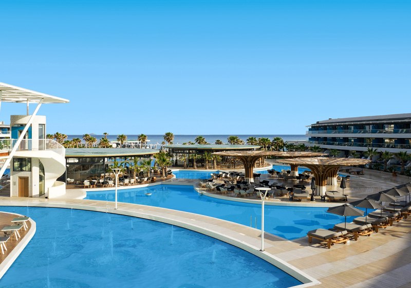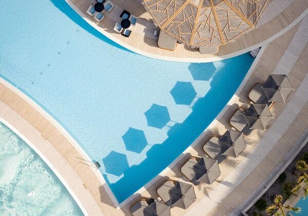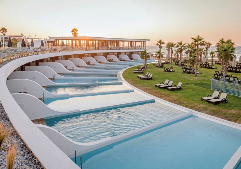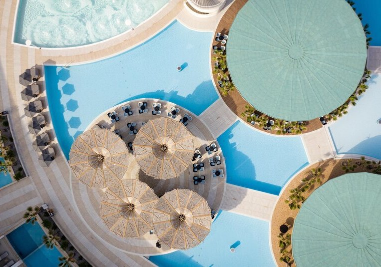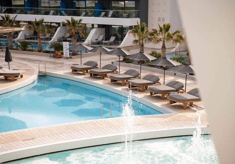 - Wasserflächen: Mehrere Pools inklusive Meerwasserbecken und Kinderbereich.