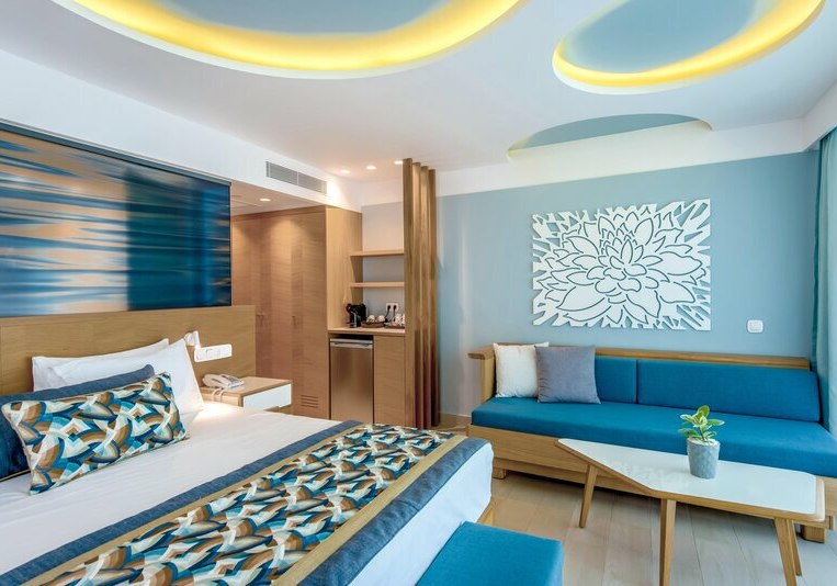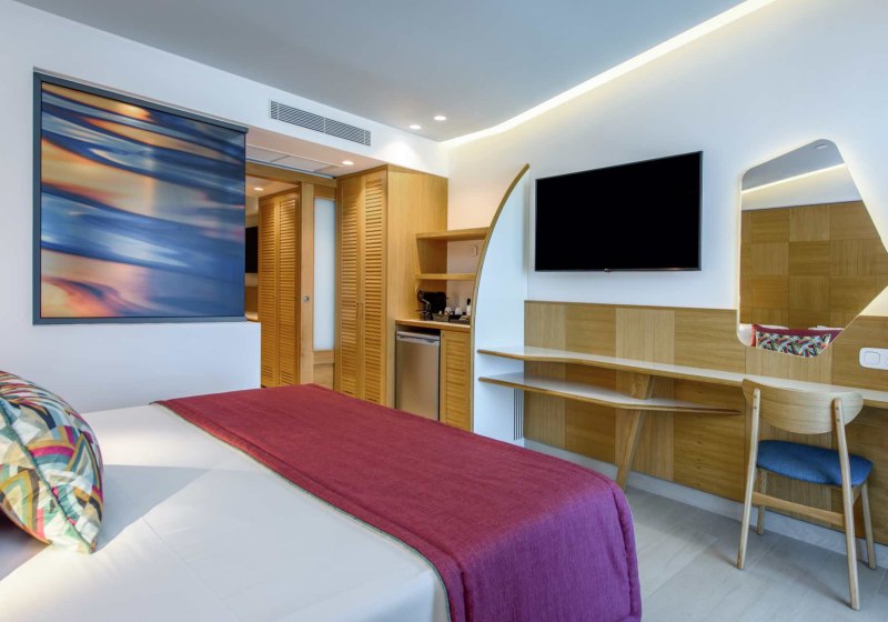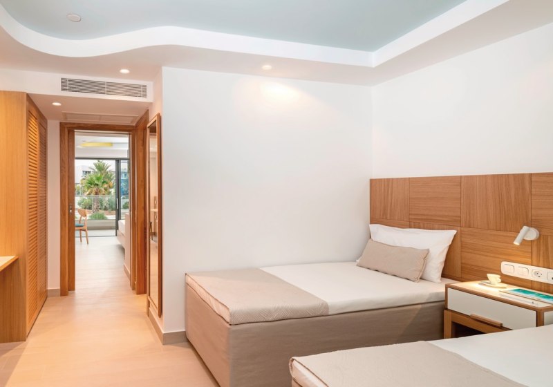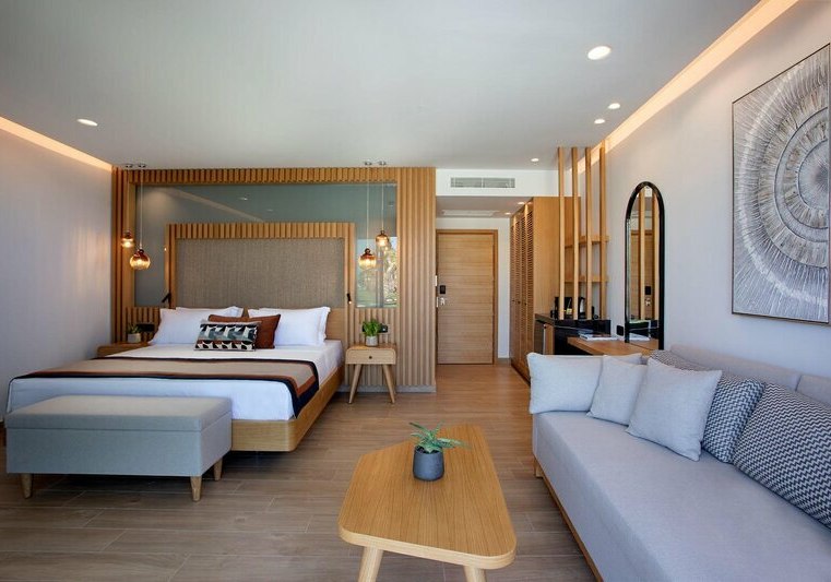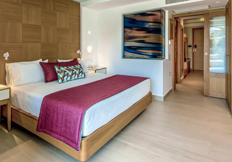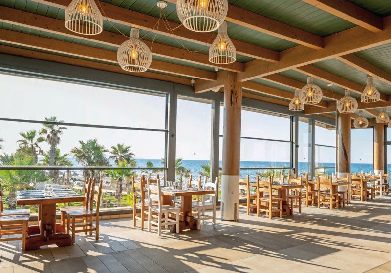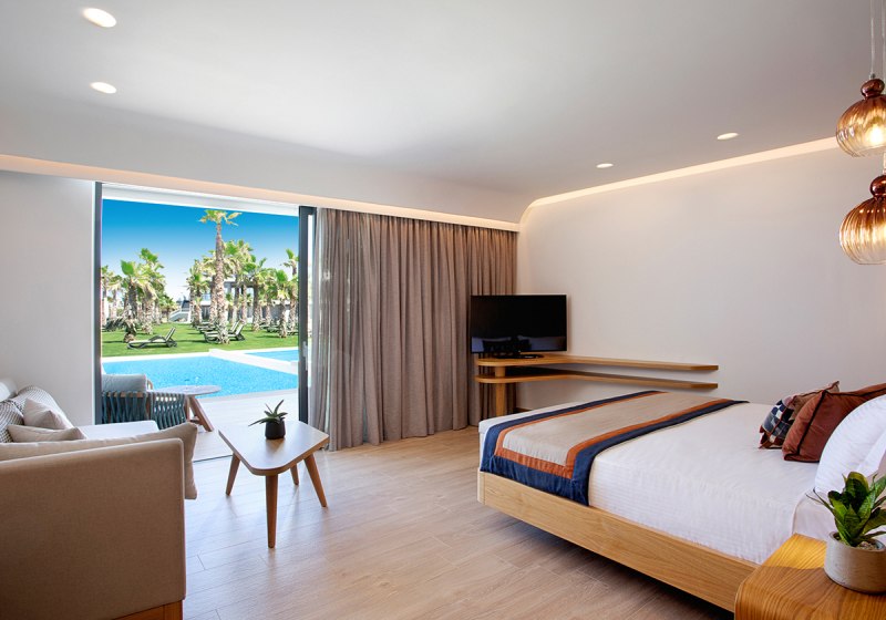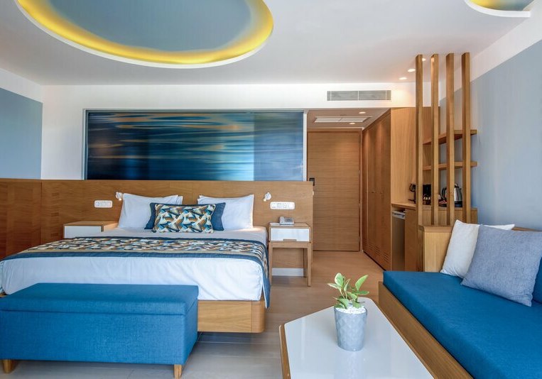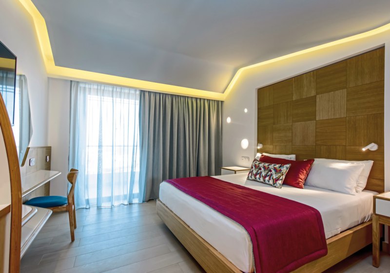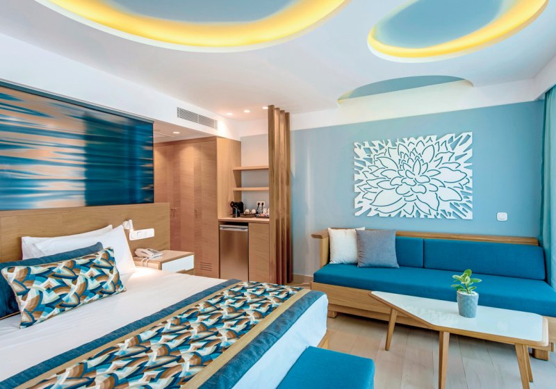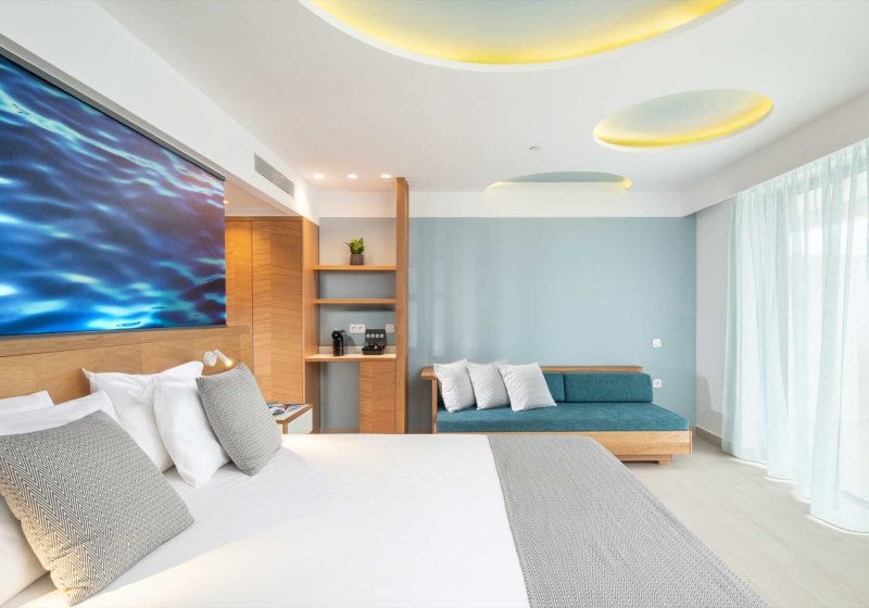 Die Zimmer verbinden Ruhe und Funktion: Klimaanlage, Schallisolation und Verdunkelungsvorhänge schaffen verlässliche Erholung. Balkon oder Terrasse öffnet den Blick – je nach Kategorie auf Meer, Garten, Pool oder Strand. Highlight: Wahlweise Meerblick für den ersten Kaffee mit Horizont.