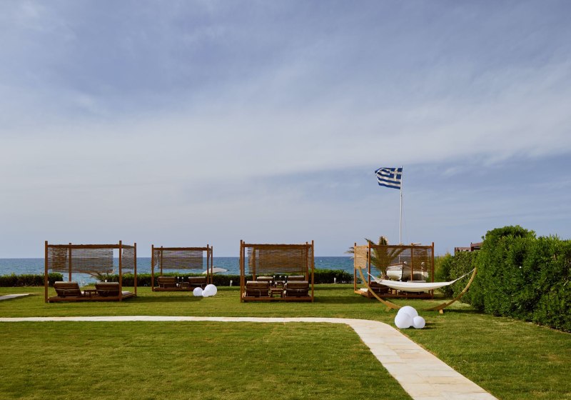 Im Maravel Star Art Hotel landet Ihr in einem überschaubaren Adults-only-Haus mit 41 Zimmern, direkt am Sand-Kiesstrand von Adelianos Kampos. Der frisch renovierte Auftritt (Teilsanierungen 2024) wirkt aufgeräumt und angenehm unprätentiös. Gartenbereiche mit Gazebos, Hängematten und Loungemöbeln schaffen ruhige Rückzugsorte, während der Pool mit Terrasse den Blick Richtung Meer öffnet.