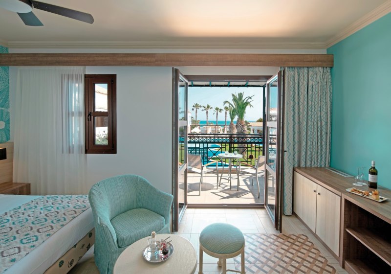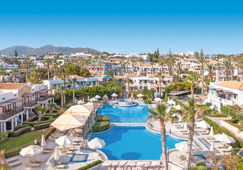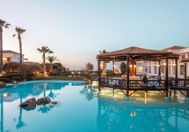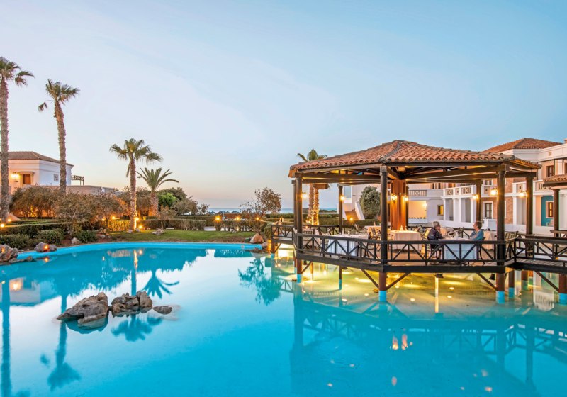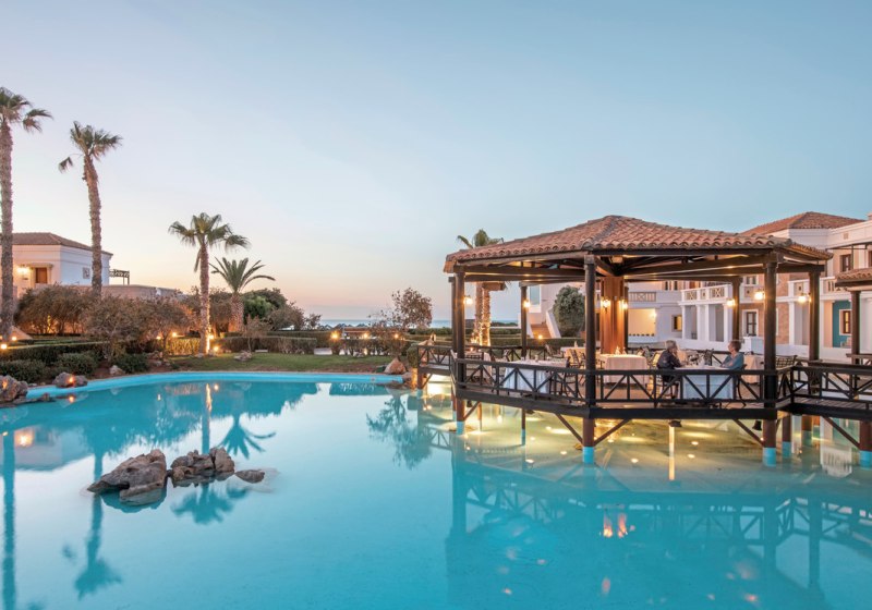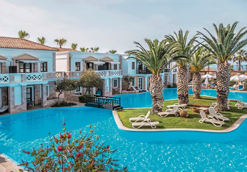 Im Mitsis Royal Mare wohnt Ihr direkt am Sand-/Kiesstrand von Chersonissos. Weitläufige Wege führen vorbei an Gärten, zwei Meerwasserpools und ruhigen Ecken bis zur Beach Bar. Familien finden Miniclub und Kinderpool, Aktive den Tennisclub und das Fitnesscenter, Erholungsuchende das Royal Mare‑Thalasso Spa.