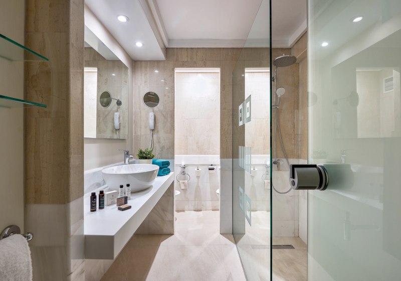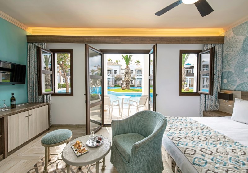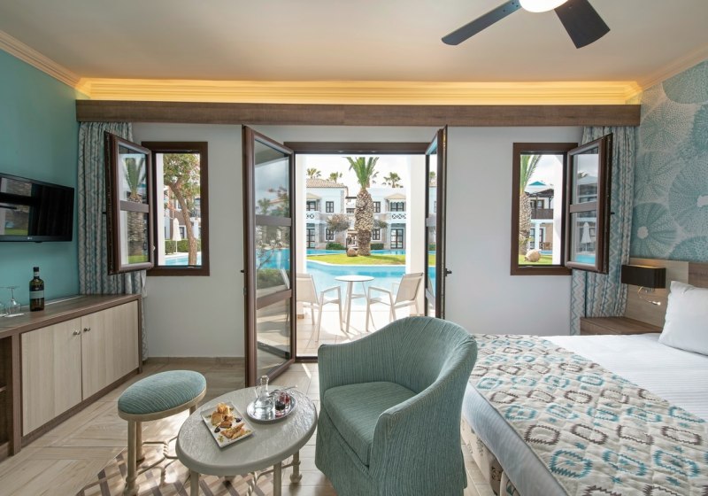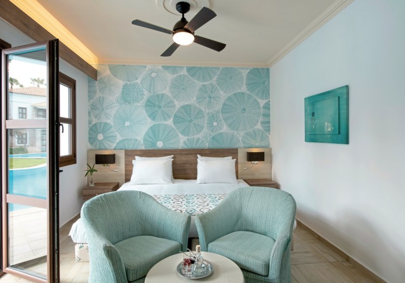Markant sind die Sharing‑Pool‑Optionen: Doppelzimmer in oberen Etagen mit Zugang zum Gemeinschaftspool oder Bungalows im Erdgeschoss mit direktem Einstieg ins Wasser. Familien profitieren von Kinderbett und Babywanne. Die Bungalows sind mit ca. 29 m² bemessen – ausreichend Platz für entspannte Abende nach Strand oder Tennis.