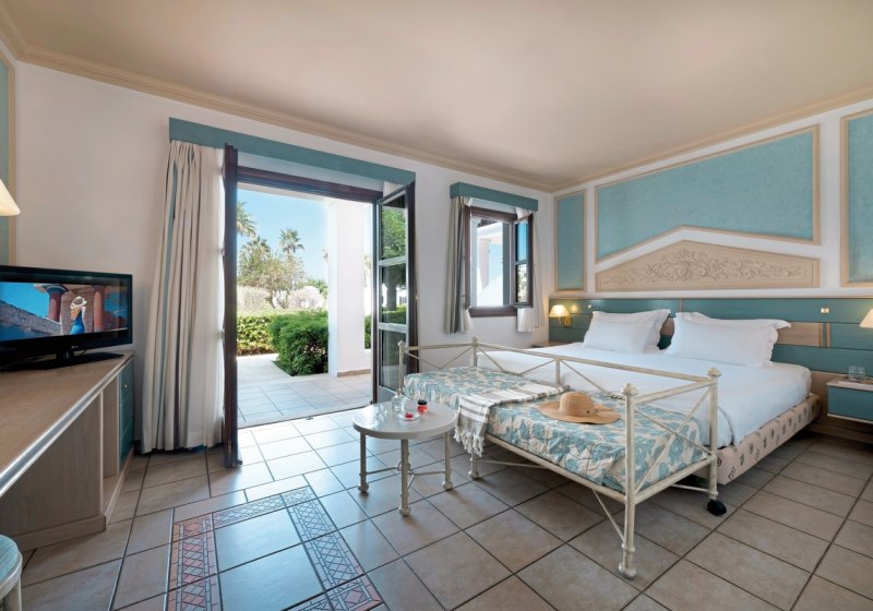 Ihr wohnt in Zimmern und Bungalows mit Balkon oder Terrasse sowie Garten‑ oder Meerblick. Ausstattungsdetails umfassen Klimaanlage, WLAN, Sat‑TV, Safe, Telefon, Kaffee‑/Teezubereiter, Badeartikel, Bademäntel und Slipper. Minibar erhaltet Ihr auf Anfrage; ein zusätzlicher Zimmerservice am Nachmittag rundet den Komfort ab.