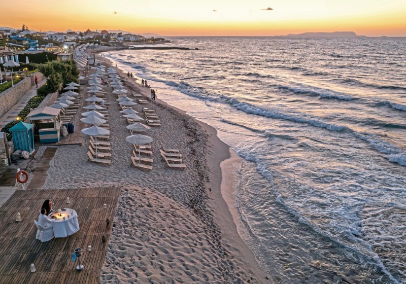 Ihr logiert direkt am Sand-/Kiesstrand von Chersonissos – ein kurzer Weg von Zimmern und Gärten bis zum Wasser. Die Umgebung bleibt entspannt, mit der Option auf Abwechslung: Das Zentrum von Chersonissos liegt rund 2 Kilometer entfernt, der Flughafen Heraklion etwa 23 Kilometer.