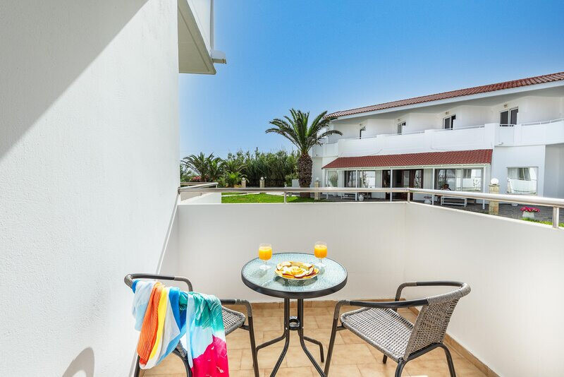 Ihr wohnt in Doppelzimmern mit etwa 22–25 Quadratmetern, klimatisiert und funktional ausgestattet. Zur Grundausstattung zählen Kühlschrank, TV, Telefon, WLAN und Mietsafe. Bad mit Dusche oder Wanne, WC und Föhn, dazu Balkon oder Terrasse – wahlweise mit Garten- oder Meerblick.
