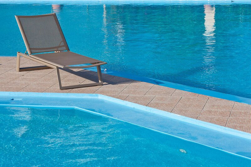 - Poolbereich: Außenpool mit Liegen, Schirmen und Sonnenterrasse.