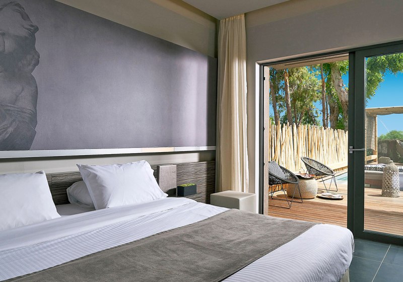 In den Suiten (ca. 32 m²) trennt ein optisches Element den Schlafbereich, zusätzliche Schlafmöglichkeiten und eine Terrasse bieten Raum. Teils geniesst Ihr Meerblick. Zimmer sind teils mit privatem Pool verfügbar – ideal, wenn Ihr Euch Rückzug am Wasser wünscht. Alle 83 Einheiten sind Nichtraucherzimmer; Rauchmelder und Details wie Willkommensgruss unterstreichen den gepflegten Rahmen.