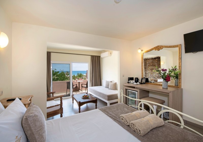 Die Zimmerauswahl reicht von Doppelzimmern bis zu Meerseite-Suiten mit privatem Pool. Mit Spa, Sauna, Massagen und leichten Sportangeboten gestaltet Ihr Euren Tag flexibel. Die Lage bei Georgioupolis und nahe dem Kournas-See schafft gute Optionen für Ausflüge. Highlight: Strandnähe, kurze Wege, stimmige Balance aus Ruhe und Bewegung.