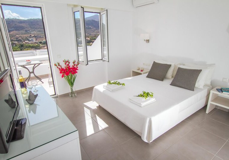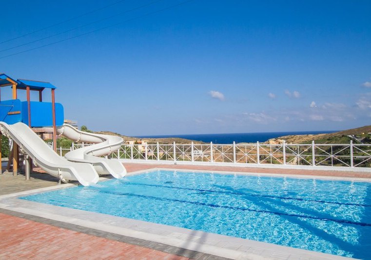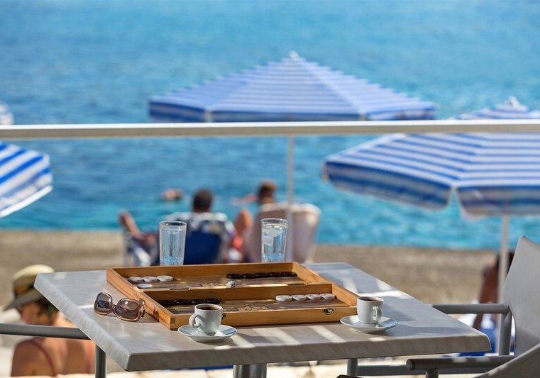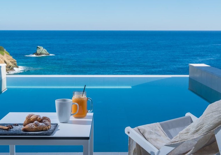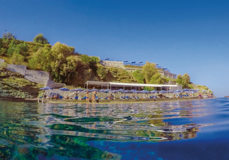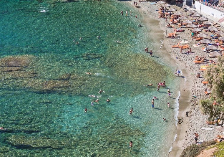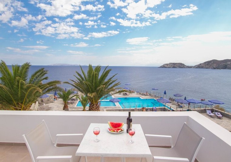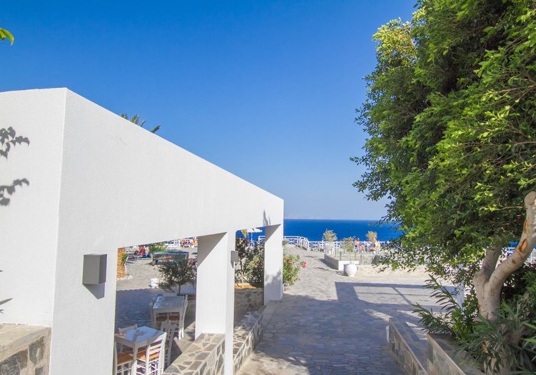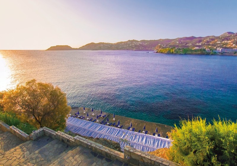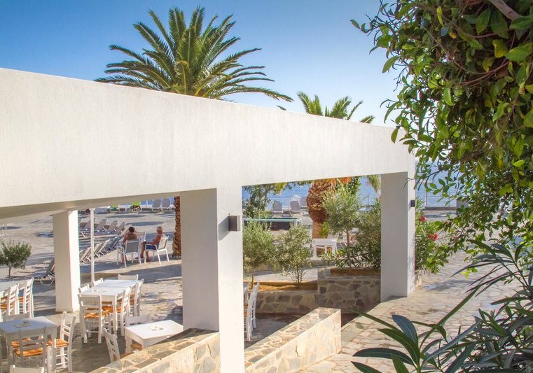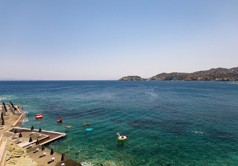 Ihr residiert in Agia Pelagia auf Kreta, direkt am Strand mit Sand- und Kiesabschnitten. Das Badeplateau erreicht Ihr über Treppen. Der Psaromoura- und der Mononafitis-Strand liegen jeweils rund 200 Meter entfernt, ideal für kurze Spaziergänge entlang der Bucht und kleine Standortwechsel zwischen Badeplätzen.